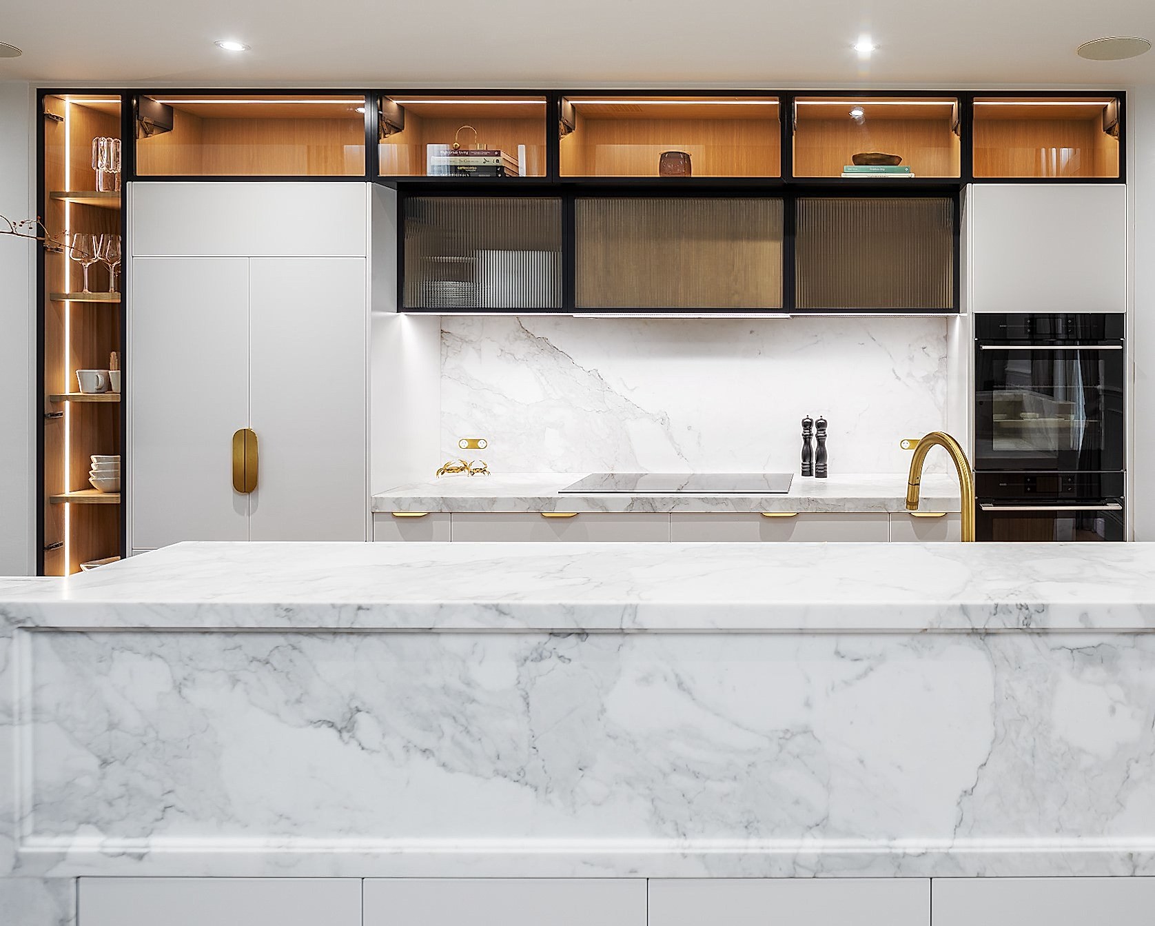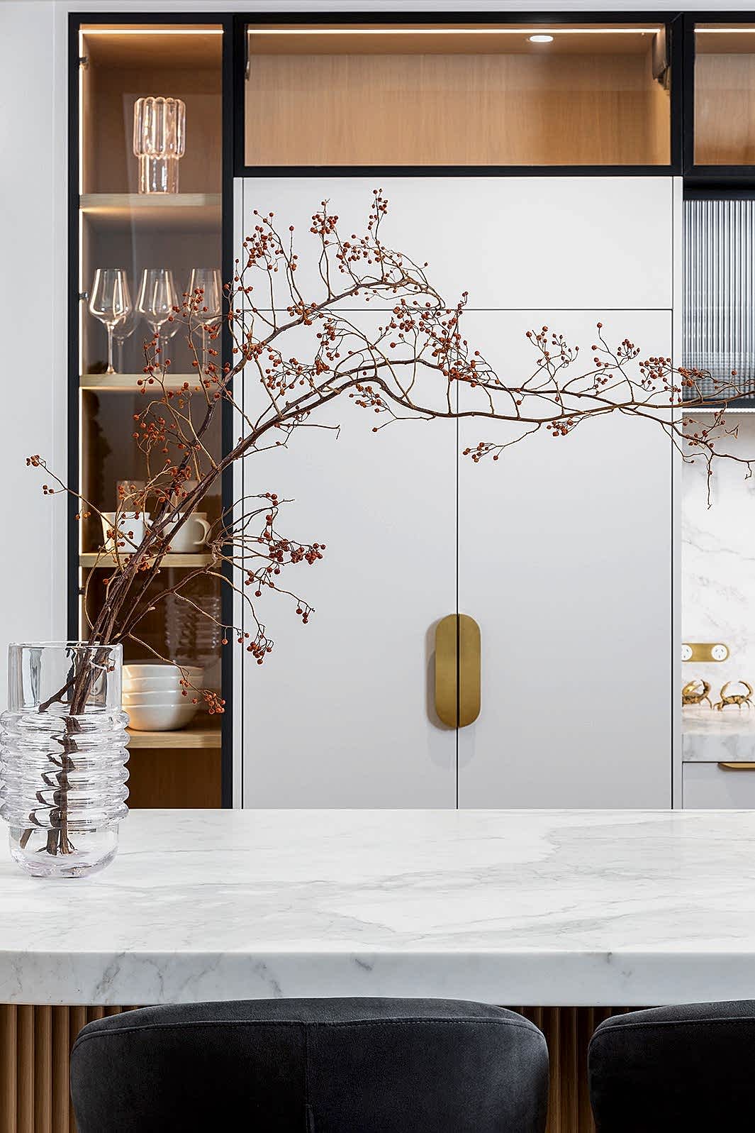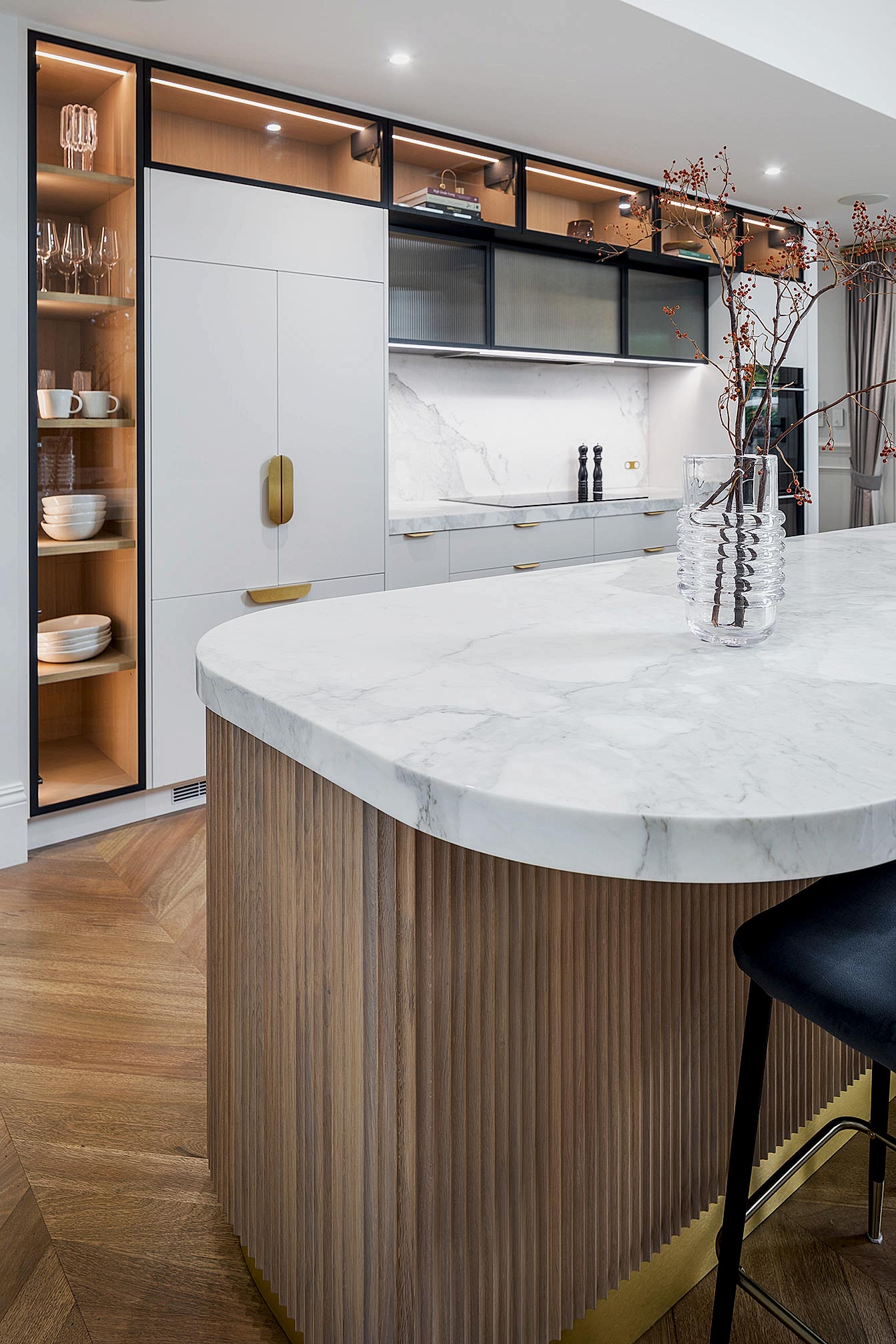Our clients sought to enhance the functionality and flow of their existing kitchen while incorporating elegant, modern elements. We transformed the space by redesigning the layout into a full-length galley-style kitchen, optimising every inch for improved circulation and usability. The removal of the nib wall between the kitchen and pantry opened up the space, creating a seamless connection between living areas. The standout feature of the kitchen is the curved long island bench, crafted from marble stone with a shaker profile and molded border relief, paired with French oak cabinetry in a scalloped profile. Tall glass door cabinetry and fluted glass accents add a touch of sophistication, while brass tapware and hardware provide a warm, luxurious finish. The enhanced walk-in pantry now boasts tall cabinetry, additional bench space, and a second large fridge, offering ample storage and convenience.