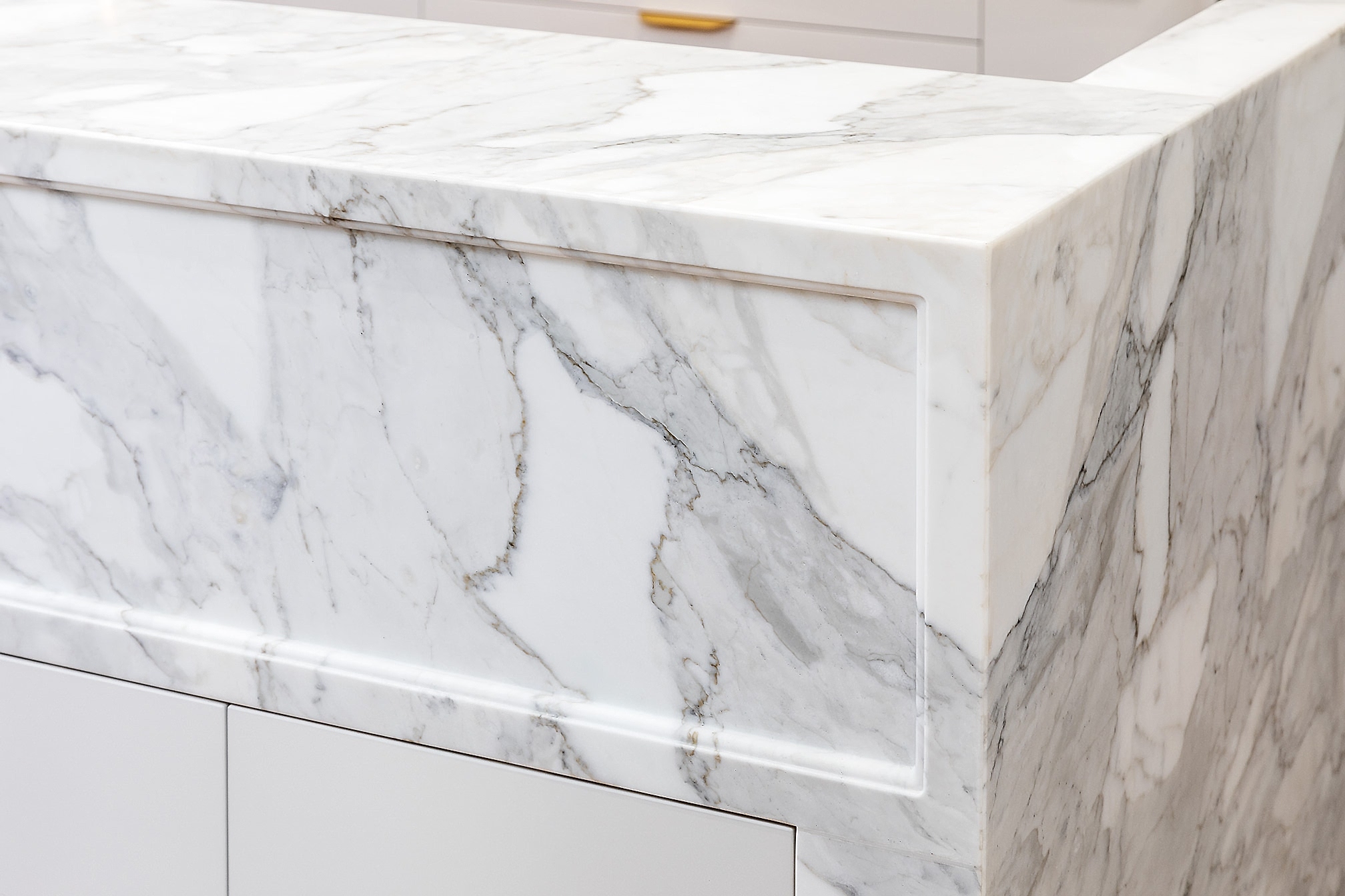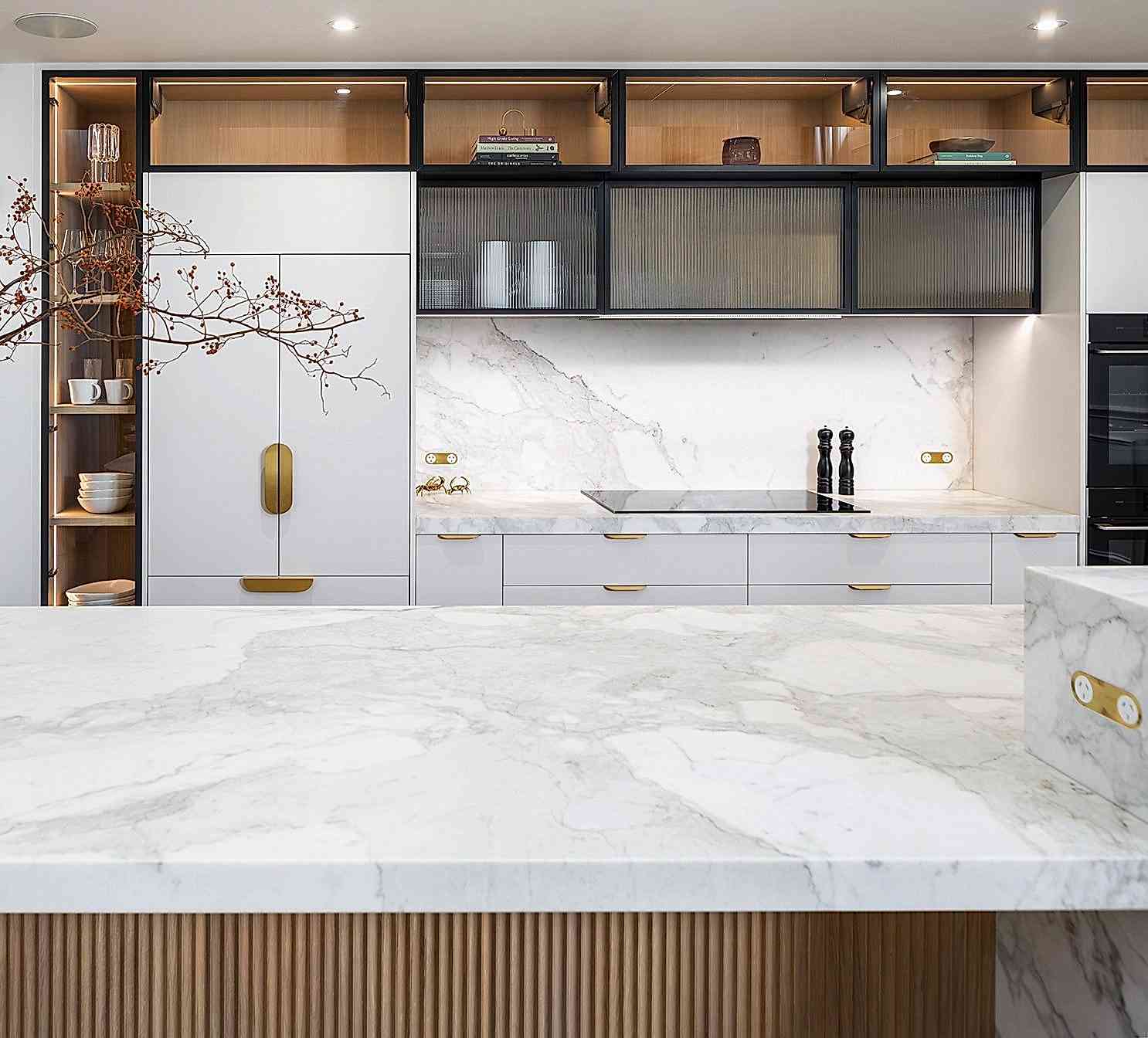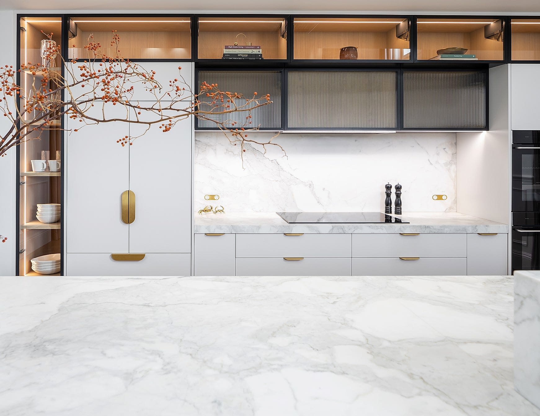 Our clients sought to enhance the functionality and flow of their existing kitchen while incorporating elegant, modern elements. We transformed the space by redesigning the layout into a full-length galley-style kitchen, optimising every inch for improved circulation and usability. The removal of the nib wall between the kitchen and pantry opened up the space, creating a seamless connection between living areas. The standout feature of the kitchen is the curved long island bench, crafted from marble stone with a shaker profile and molded border relief, paired with French oak cabinetry in a scalloped profile. Tall glass door cabinetry and fluted glass accents add a touch of sophistication, while brass tapware and hardware provide a warm, luxurious finish. The enhanced walk-in pantry now boasts tall cabinetry, additional bench space, and a second large fridge, offering ample storage and convenience.