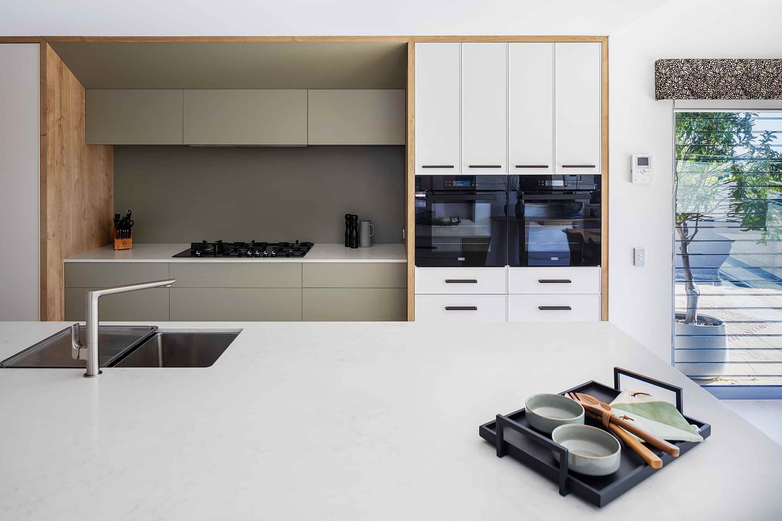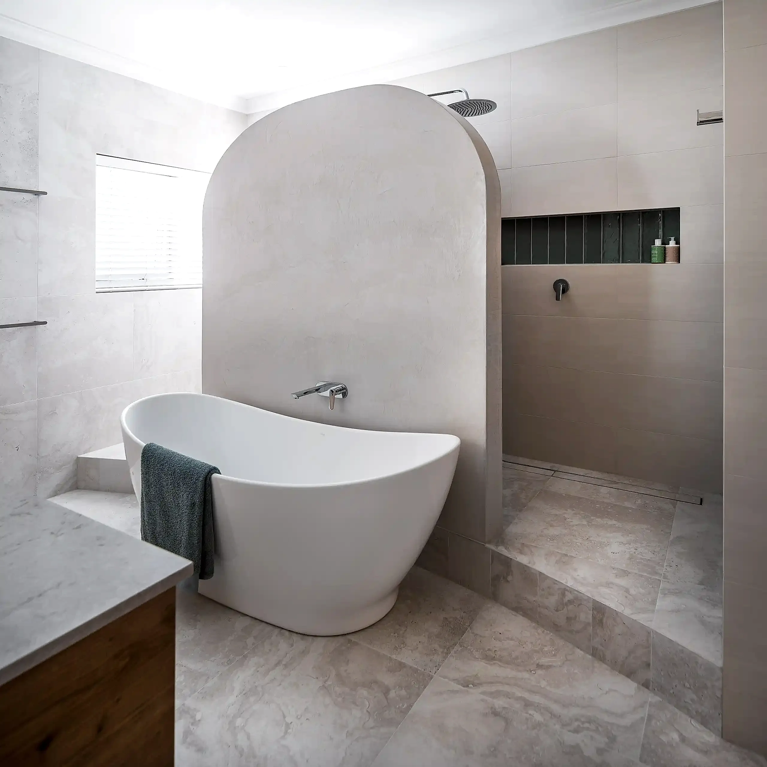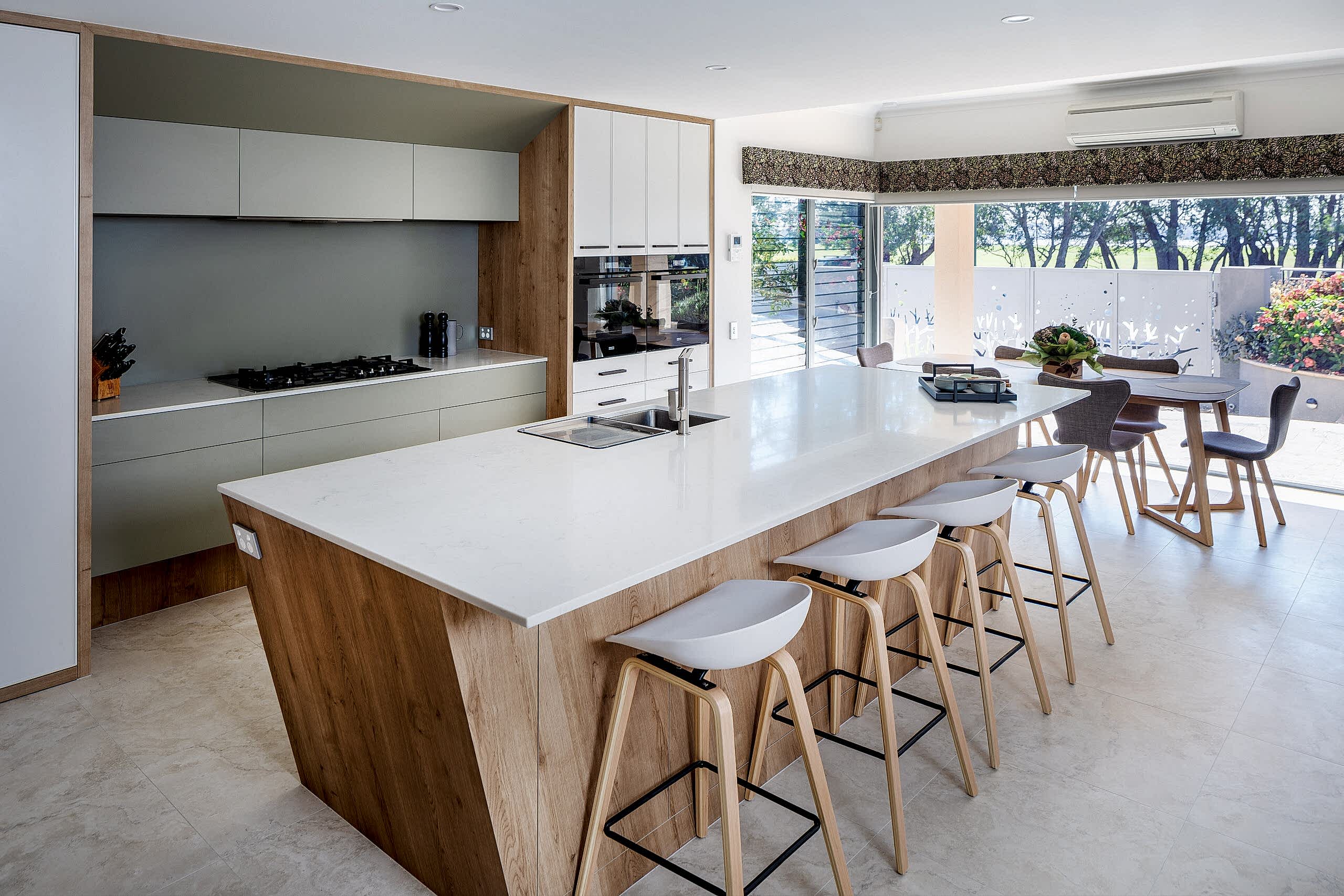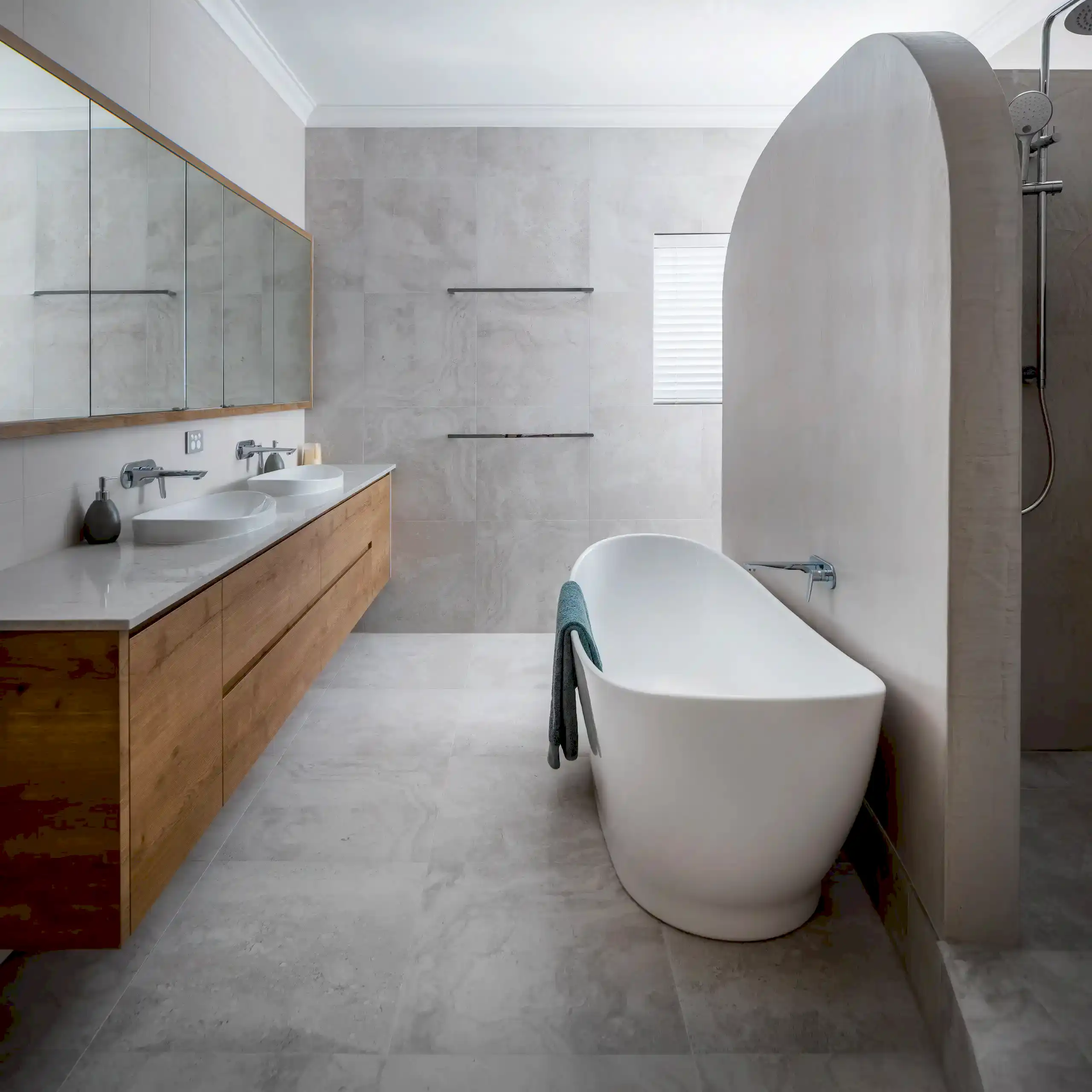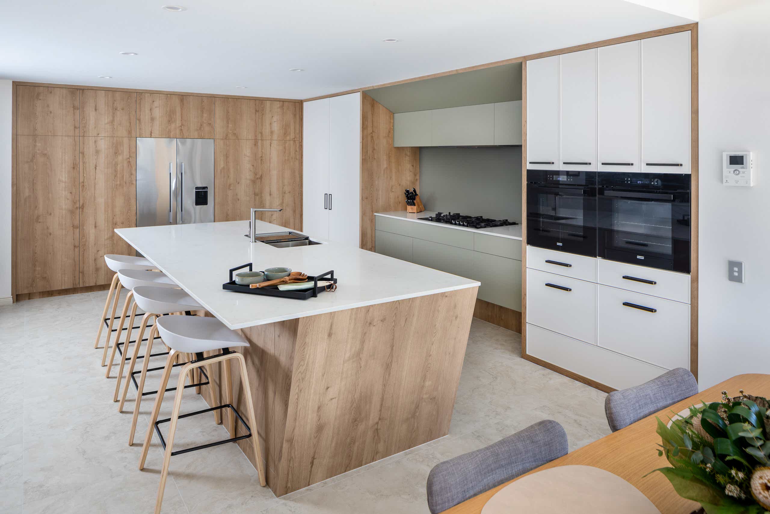 Our clients wanted a more functional kitchen and a modern ensuite that harmonised with their home. The kitchen was previously closed off from the living and dining areas, making it feel isolated. We transformed it by opening up the dividing wall and relocating the kitchen to the back wall, facing the living area. This created an inviting, communal space ideal for entertaining. The large island bench with a breakfast bar features subtle woodgrain patterns that continue into the overhead cabinetry. Ample storage includes full-height cabinets, a walk-in pantry, and an oven stack, all designed for a clutter-free, cohesive look. For the ensuite, we enhanced the design by incorporating raised levels in the shower and toilet, turning them into standout features. The contemporary interior design employs graceful curves to elegantly divide the space, creating a perfect balance between privacy and openness. This flow of curvature is beautifully echoed in the fixtures and fittings, resulting in a cohesive and visually striking ensuite.