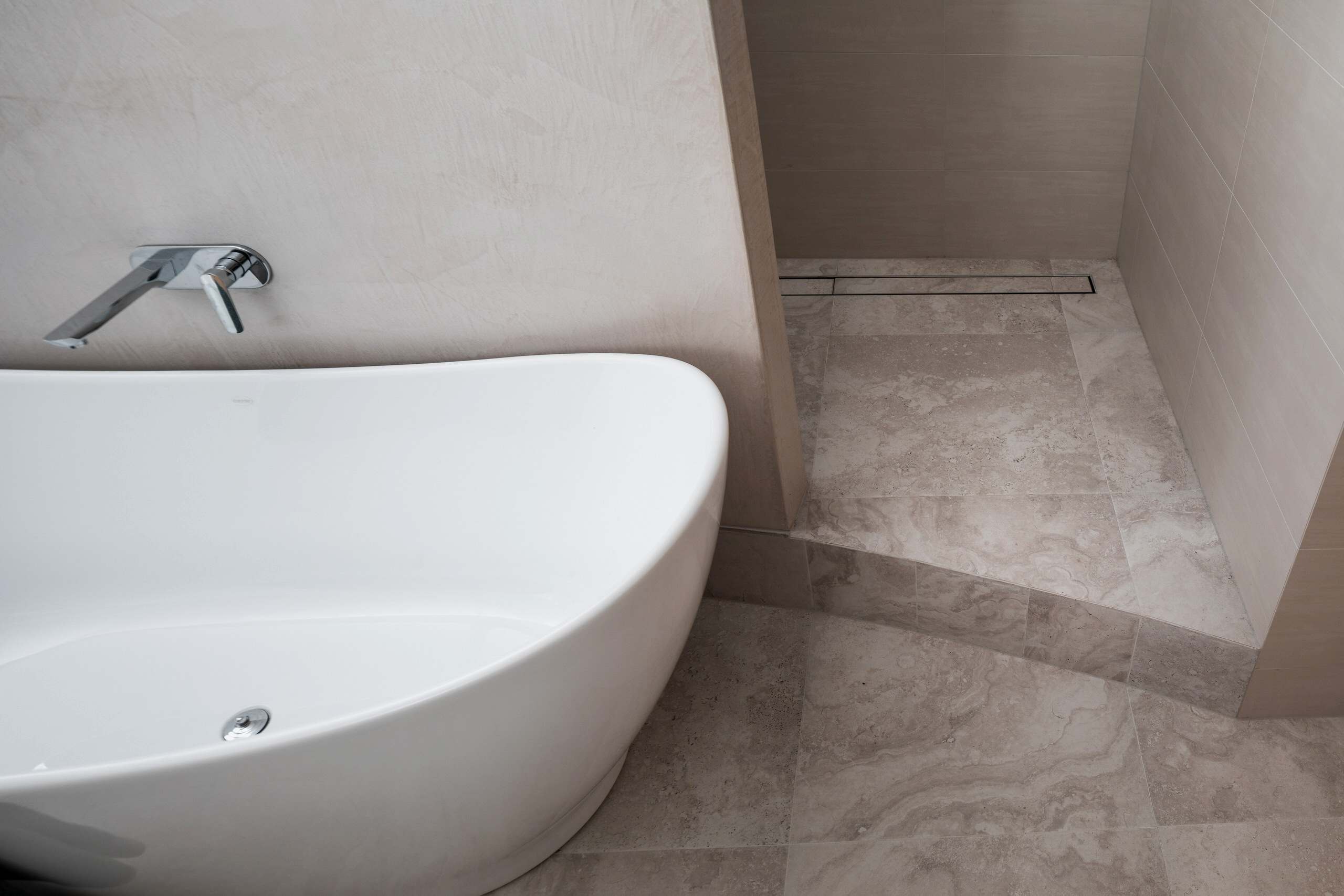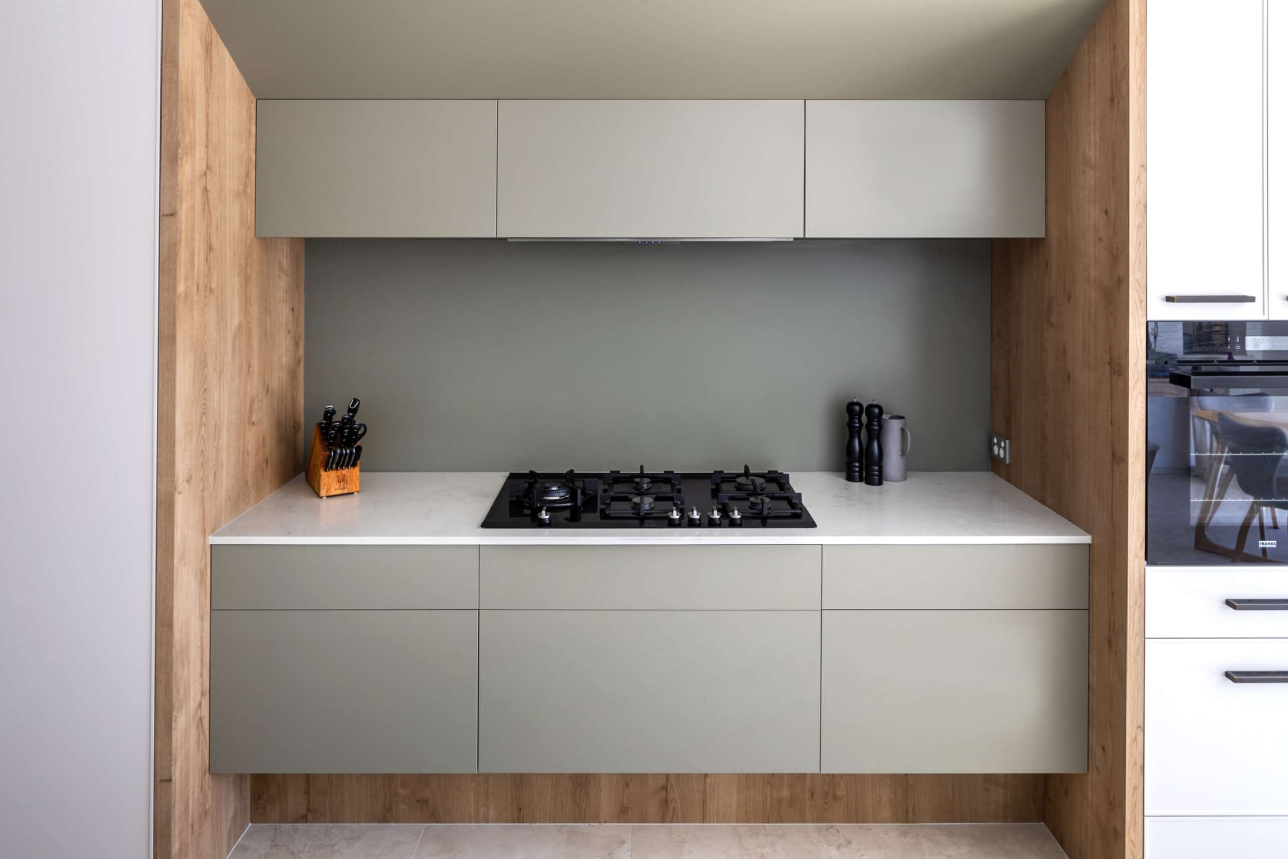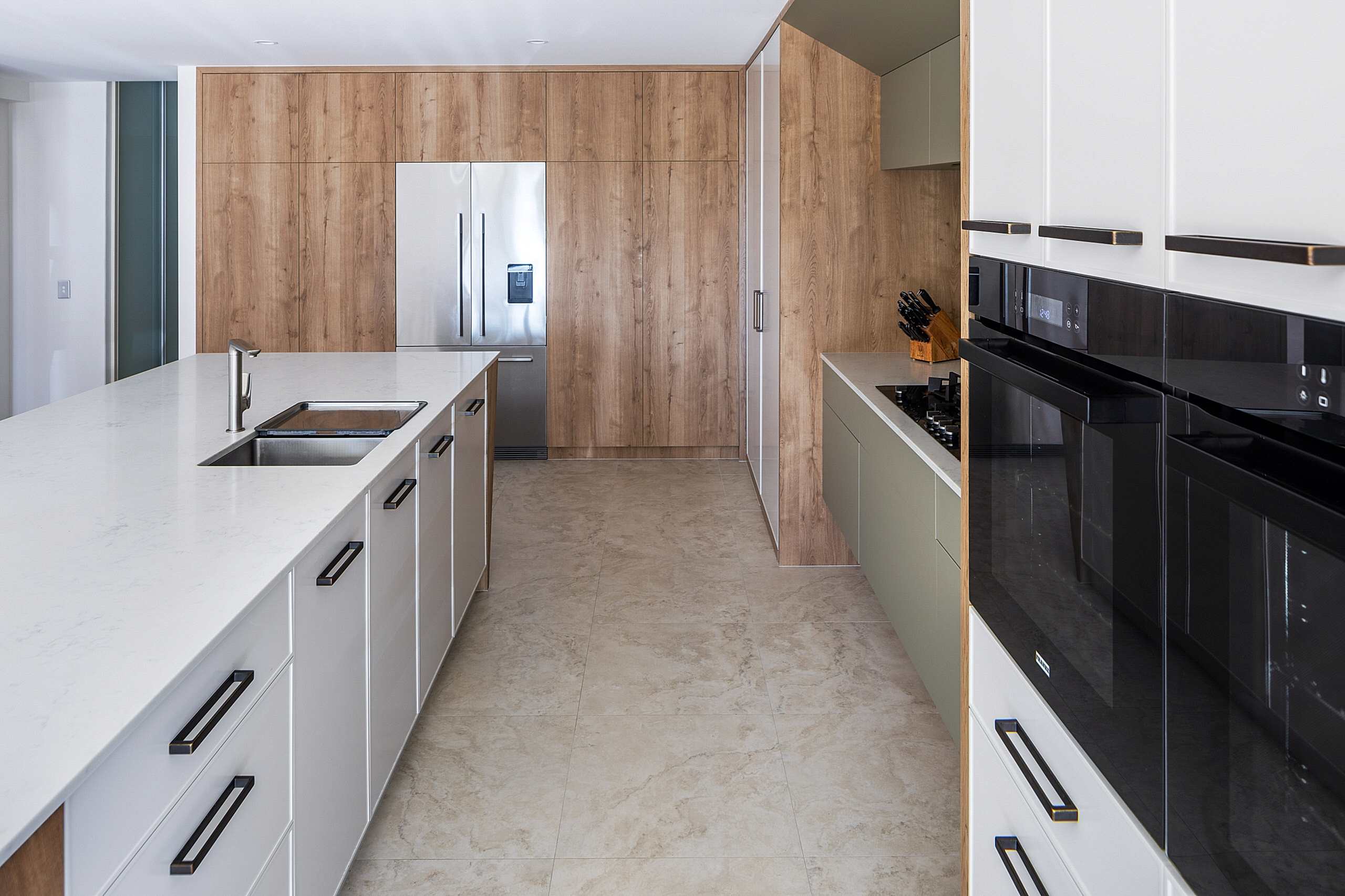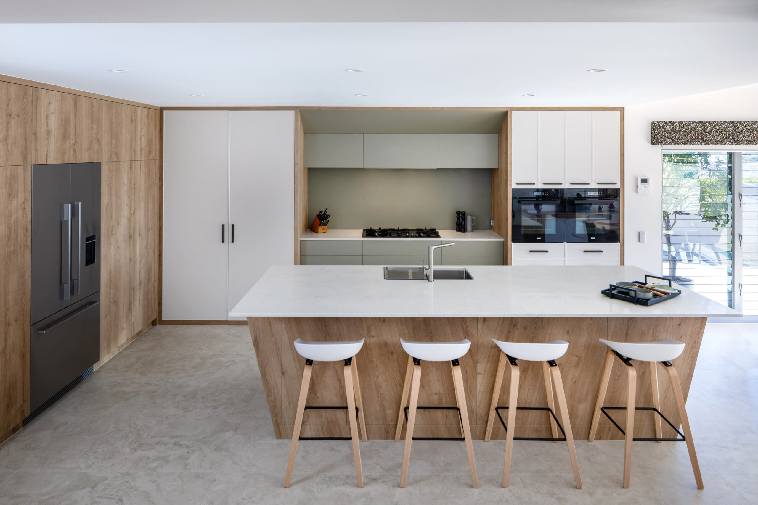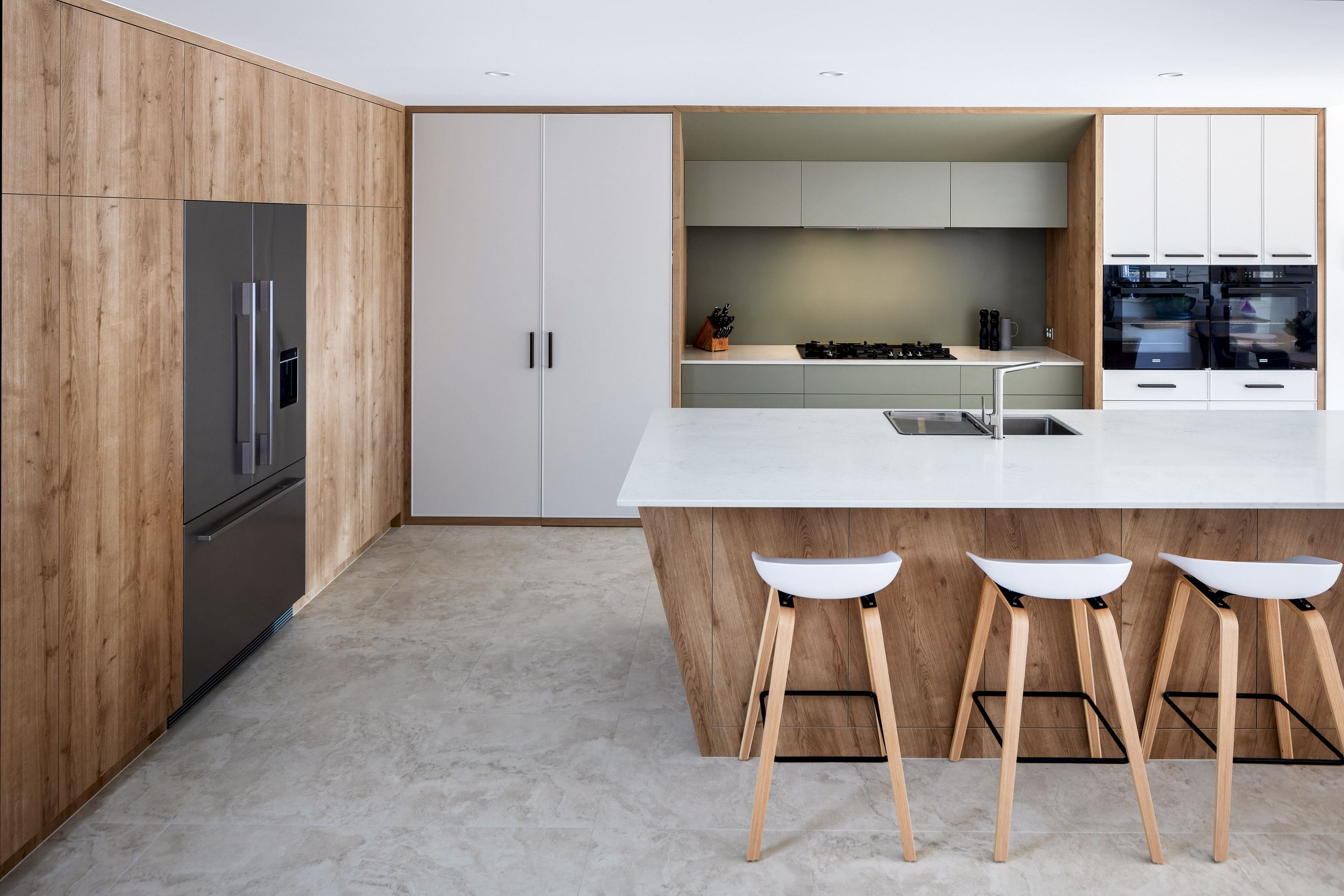 Our clients wanted a more functional kitchen and a modern ensuite that harmonised with their home. The kitchen was previously closed off from the living and dining areas, making it feel isolated. We transformed it by opening up the dividing wall and relocating the kitchen to the back wall, facing the living area. This created an inviting, communal space ideal for entertaining. The large island bench with a breakfast bar features subtle woodgrain patterns that continue into the overhead cabinetry. Ample storage includes full-height cabinets, a walk-in pantry, and an oven stack, all designed for a clutter-free, cohesive look. For the ensuite, we enhanced the design by incorporating raised levels in the shower and toilet, turning them into standout features. The contemporary interior design employs graceful curves to elegantly divide the space, creating a perfect balance between privacy and openness. This flow of curvature is beautifully echoed in the fixtures and fittings, resulting in a cohesive and visually striking ensuite.