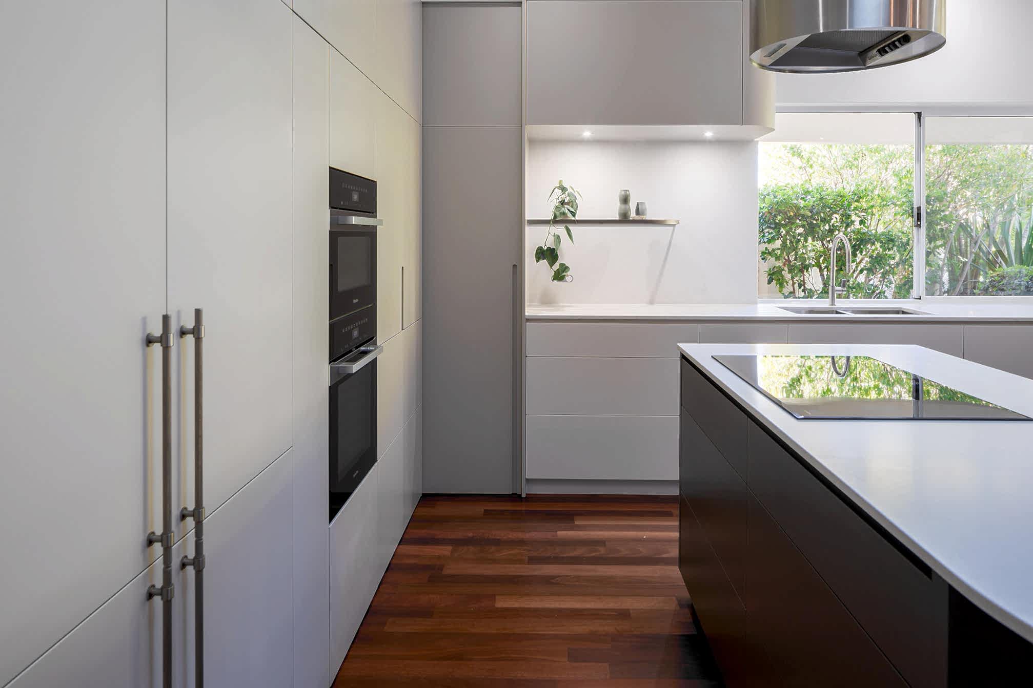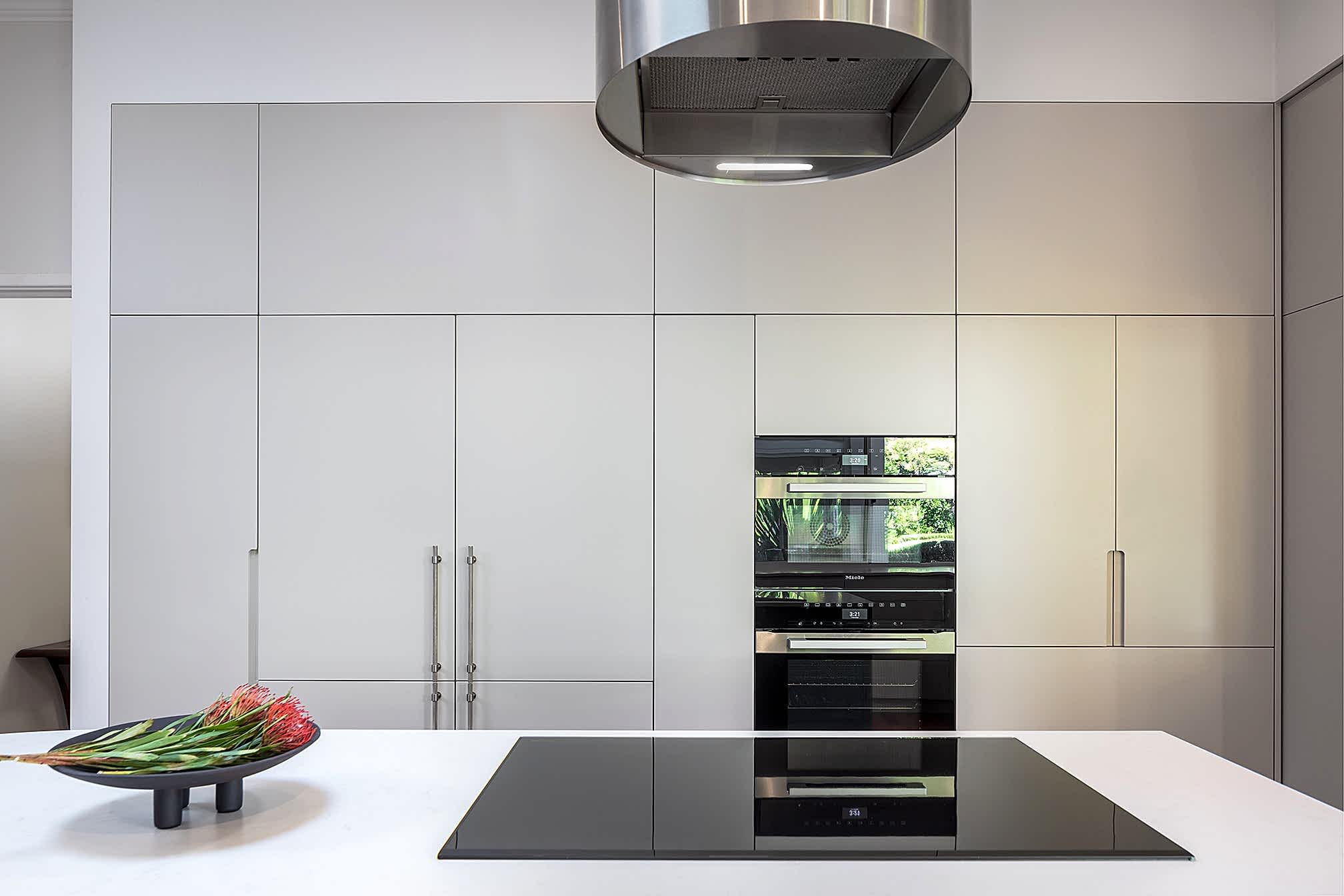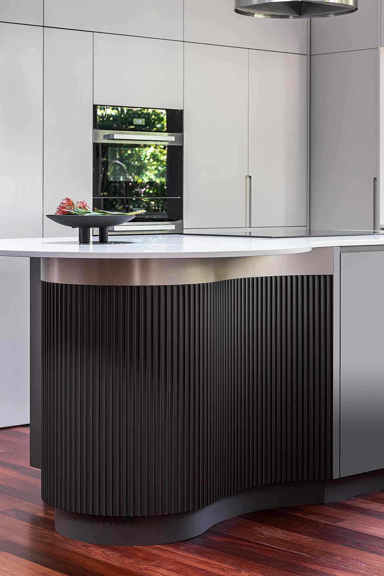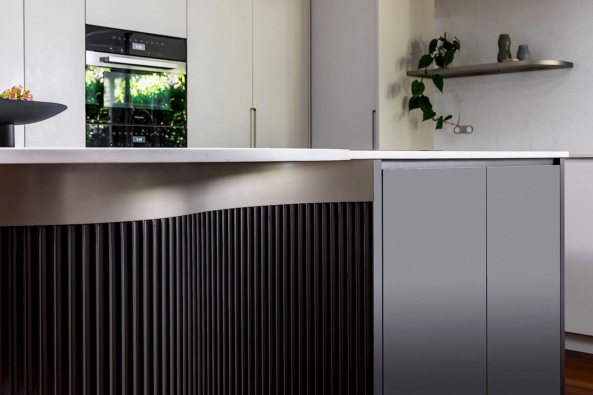 Our client’s kitchen, once cluttered and inefficient, was transformed to achieve the streamlined beauty they desired. The redesign cantered on enhancing space and functionality with a feature curved island that includes an induction cooktop and Qasair Rangehood, opening up the cooking area and adding seating and storage. A concealed pantry provides extra storage and workspace while keeping the main area uncluttered. Contemporary design elements, such as clean lines, minimalist finishes, steel and glass shelving, satin cabinetry, fluted island profiling, and curved stone benchtops, were incorporated to elevate the kitchen’s aesthetic. The layout was optimised to improve functionality, with strategically arranged work zones enhancing efficiency. Statement lighting with inset-down lights and a circular skylight floods the space with natural light, enhancing colours and creating a sense of height. This comprehensive redesign resulted in a modern, harmonious kitchen that perfectly meets the client’s functional and aesthetic needs.