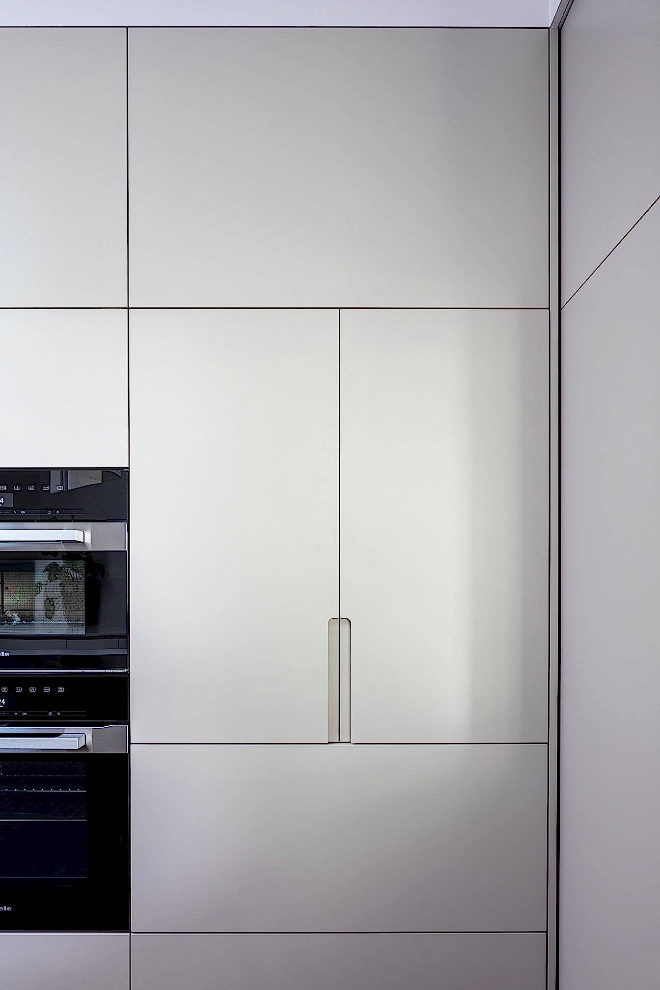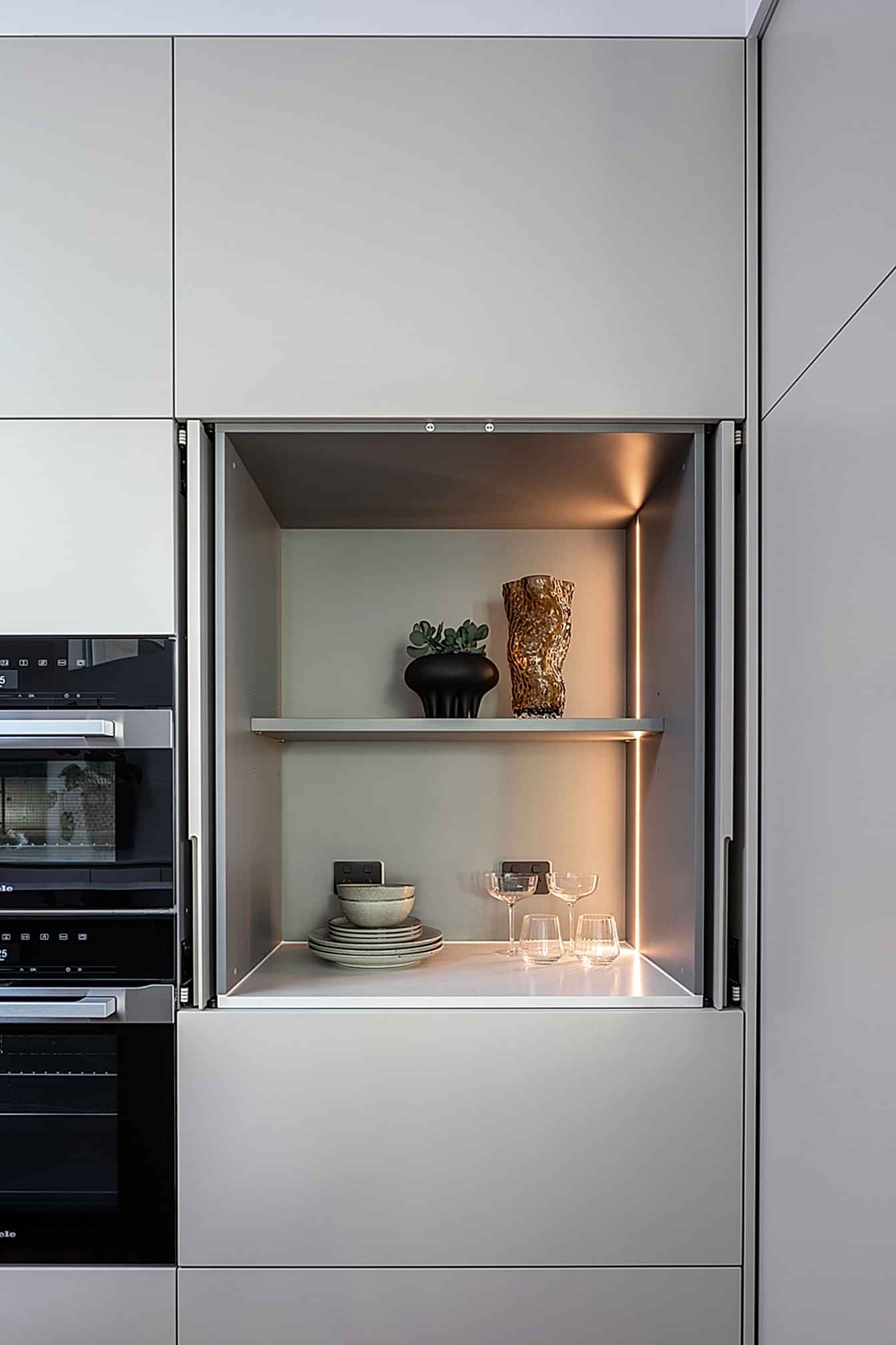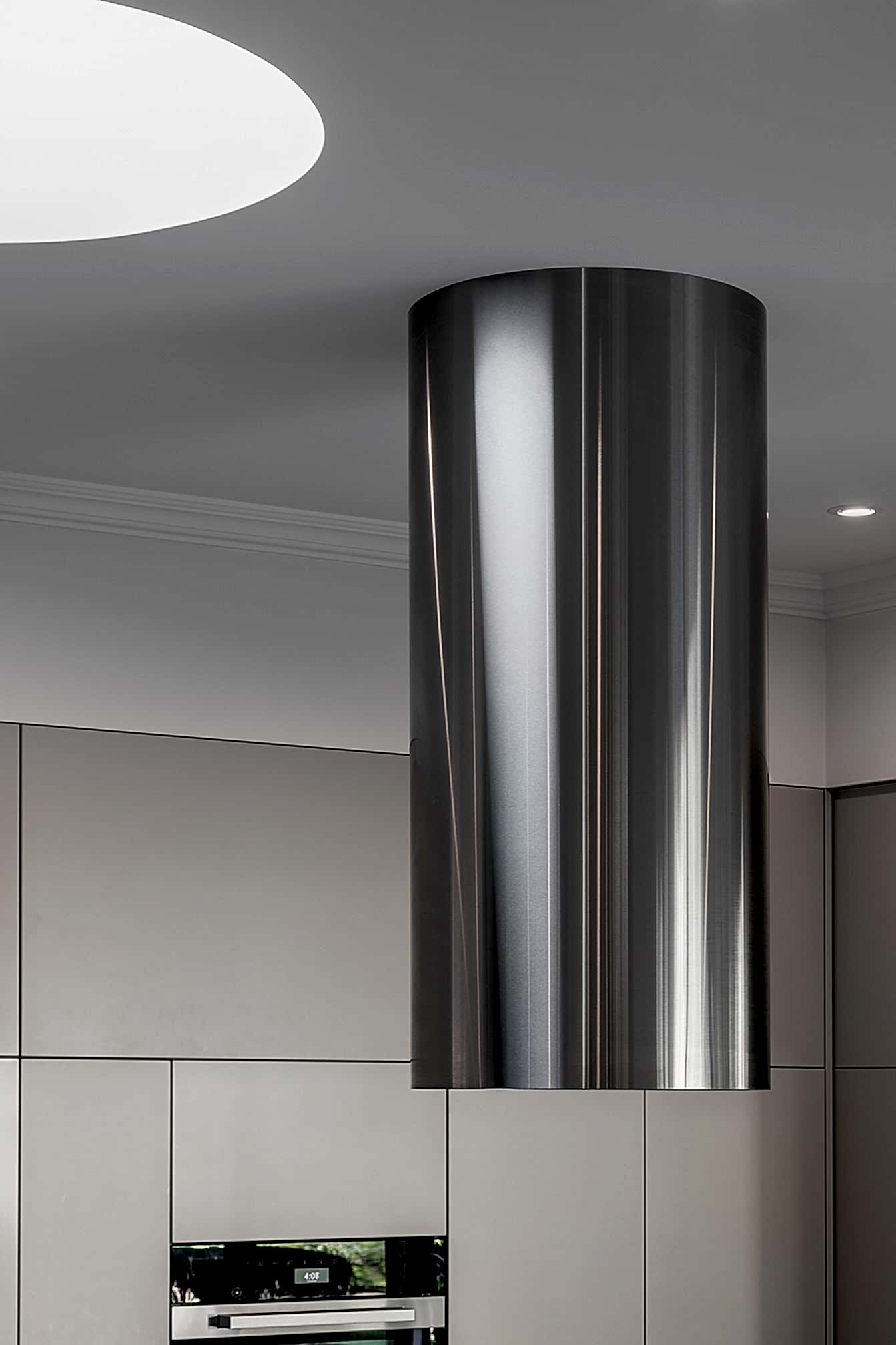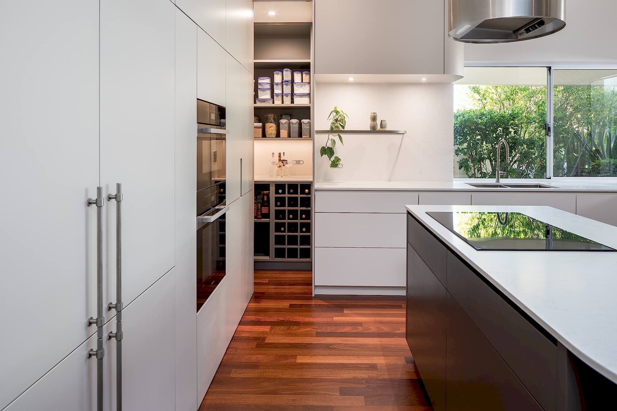 Our client’s kitchen, once cluttered and inefficient, was transformed to achieve the streamlined beauty they desired. The redesign cantered on enhancing space and functionality with a feature curved island that includes an induction cooktop and Qasair Rangehood, opening up the cooking area and adding seating and storage. A concealed pantry provides extra storage and workspace while keeping the main area uncluttered. Contemporary design elements, such as clean lines, minimalist finishes, steel and glass shelving, satin cabinetry, fluted island profiling, and curved stone benchtops, were incorporated to elevate the kitchen’s aesthetic. The layout was optimised to improve functionality, with strategically arranged work zones enhancing efficiency. Statement lighting with inset-down lights and a circular skylight floods the space with natural light, enhancing colours and creating a sense of height. This comprehensive redesign resulted in a modern, harmonious kitchen that perfectly meets the client’s functional and aesthetic needs.