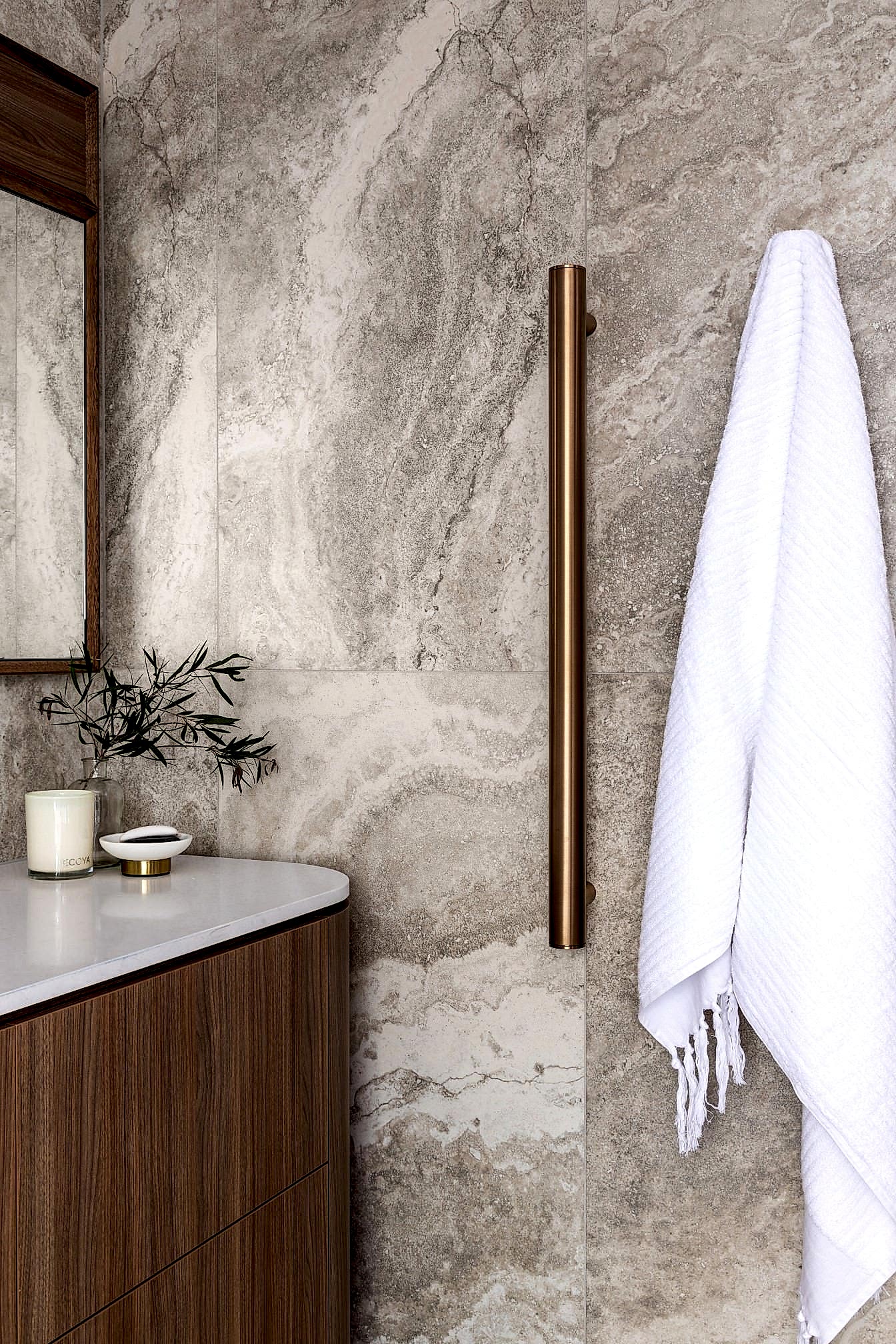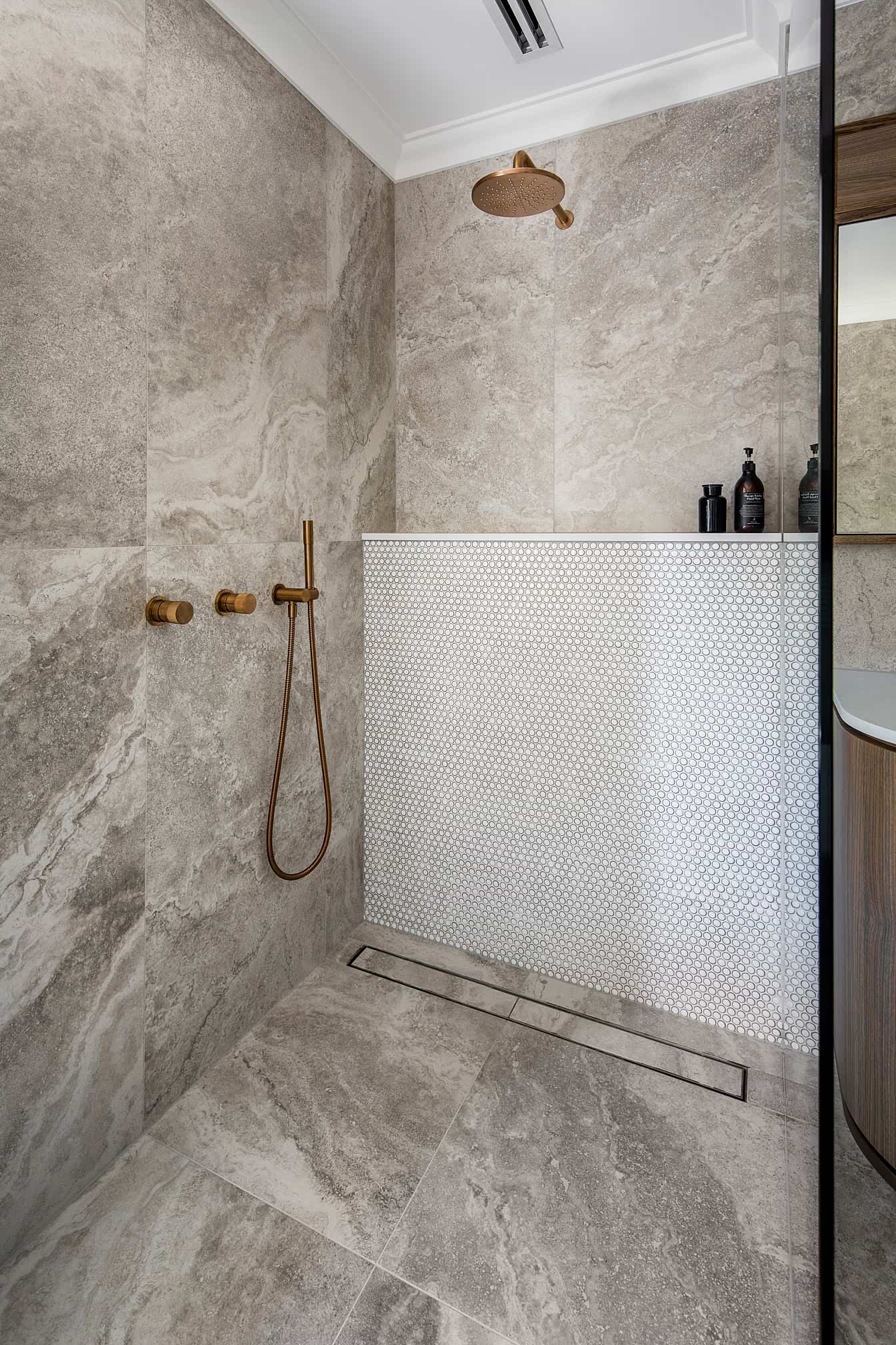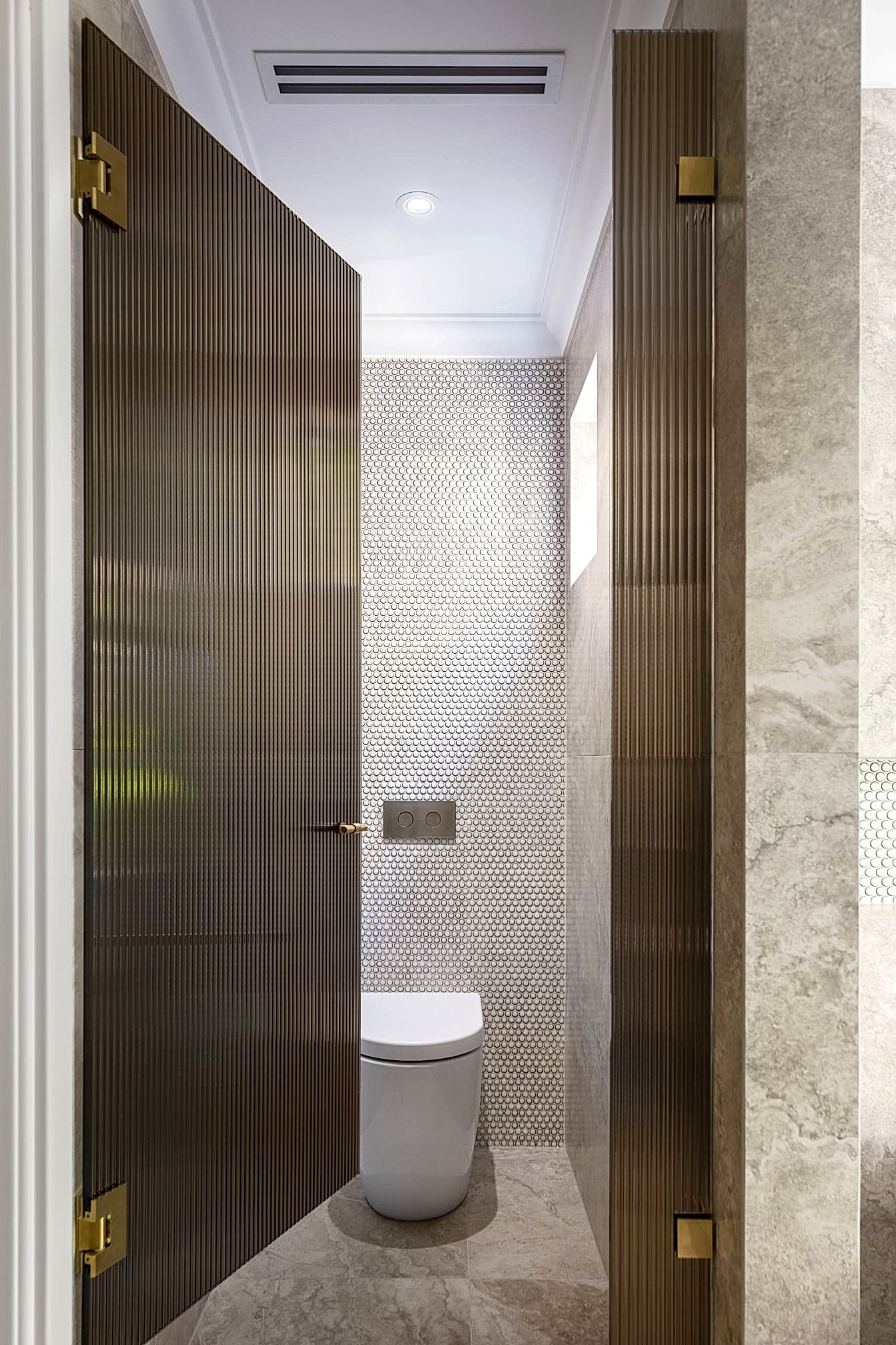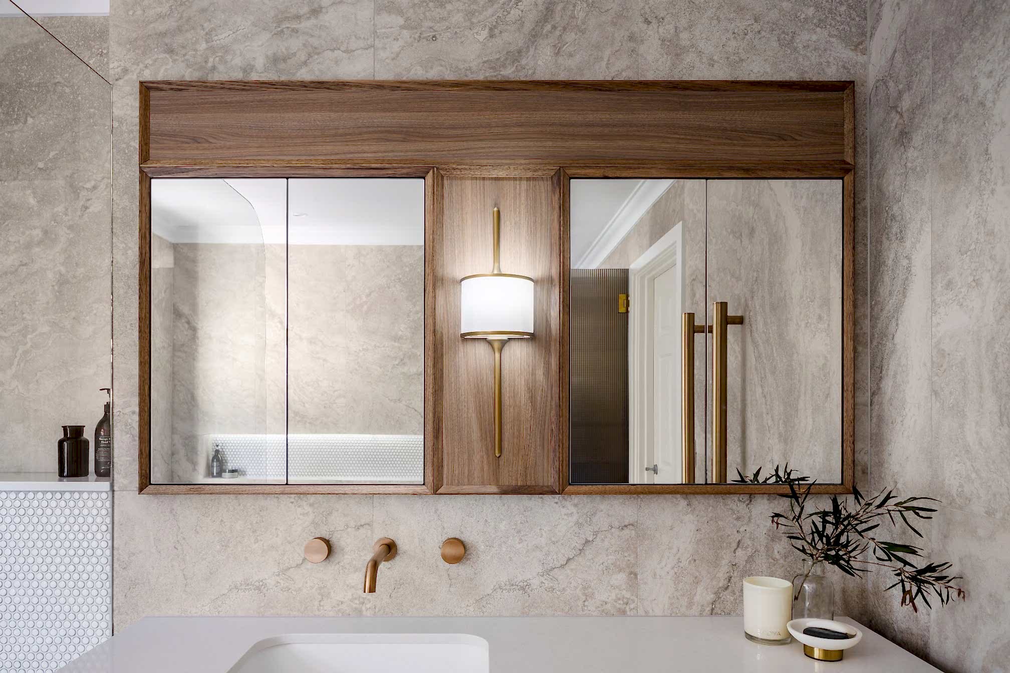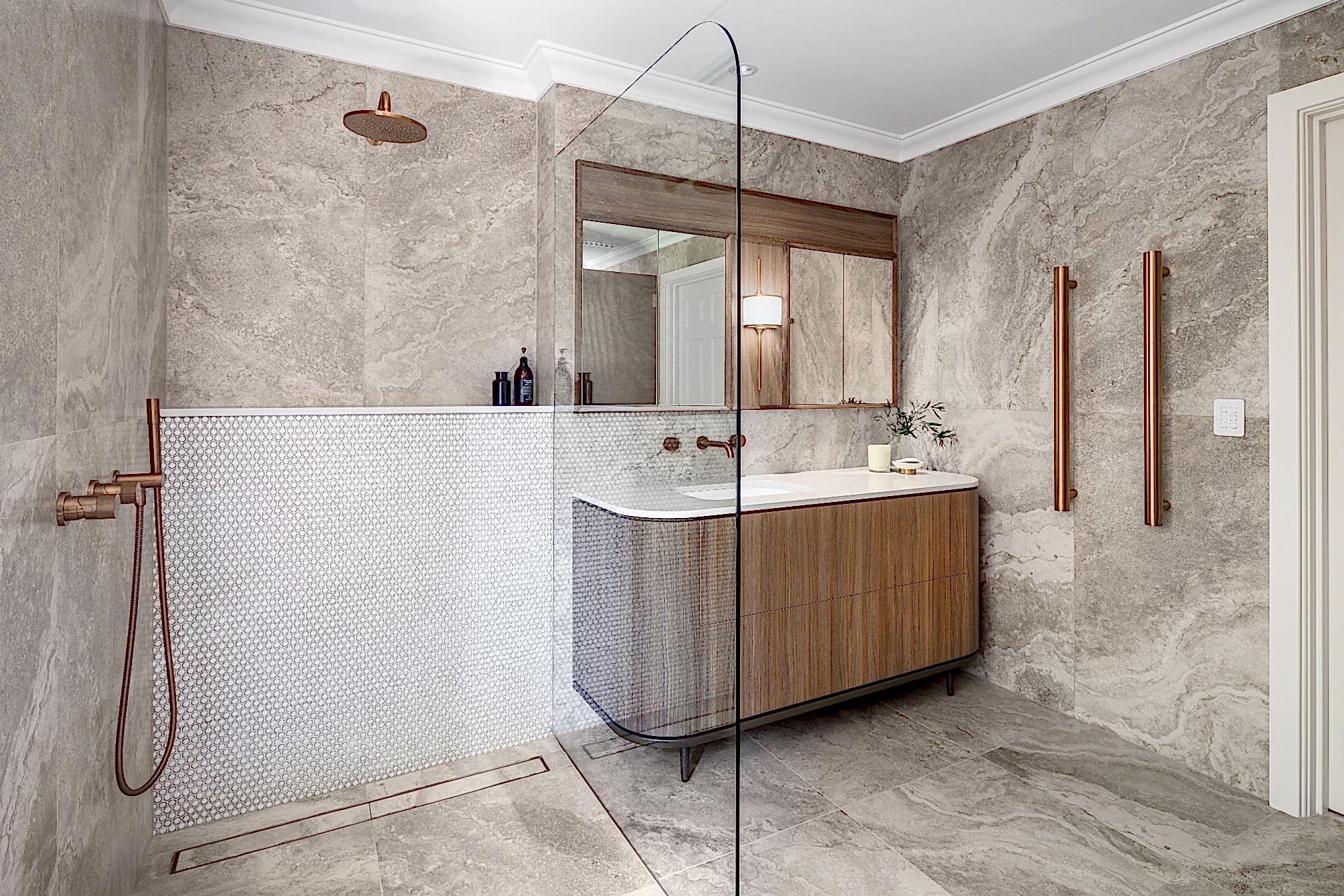 Our clients sought a stylish, user-friendly space with ample storage that aligns with both contemporary and mid-century modern design. Our interior design transformed the space into a seamless blend of contemporary minimalism and mid-century warmth. We removed the corner spa, expanding the shower and adding a separate toilet room. The ensuite now features warm neutral tones, custom walnut cabinetry with subtle curves, and bronze hardware that ties the design together. Stone-look porcelain tiles extend floor to ceiling, enhancing the room’s spaciousness. The centerpiece is a custom walnut vanity with curved edges, paired with an organic white Caesarstone benchtop and recessed mirrored cabinetry. A Mona brass feature light adds a luxurious touch.
