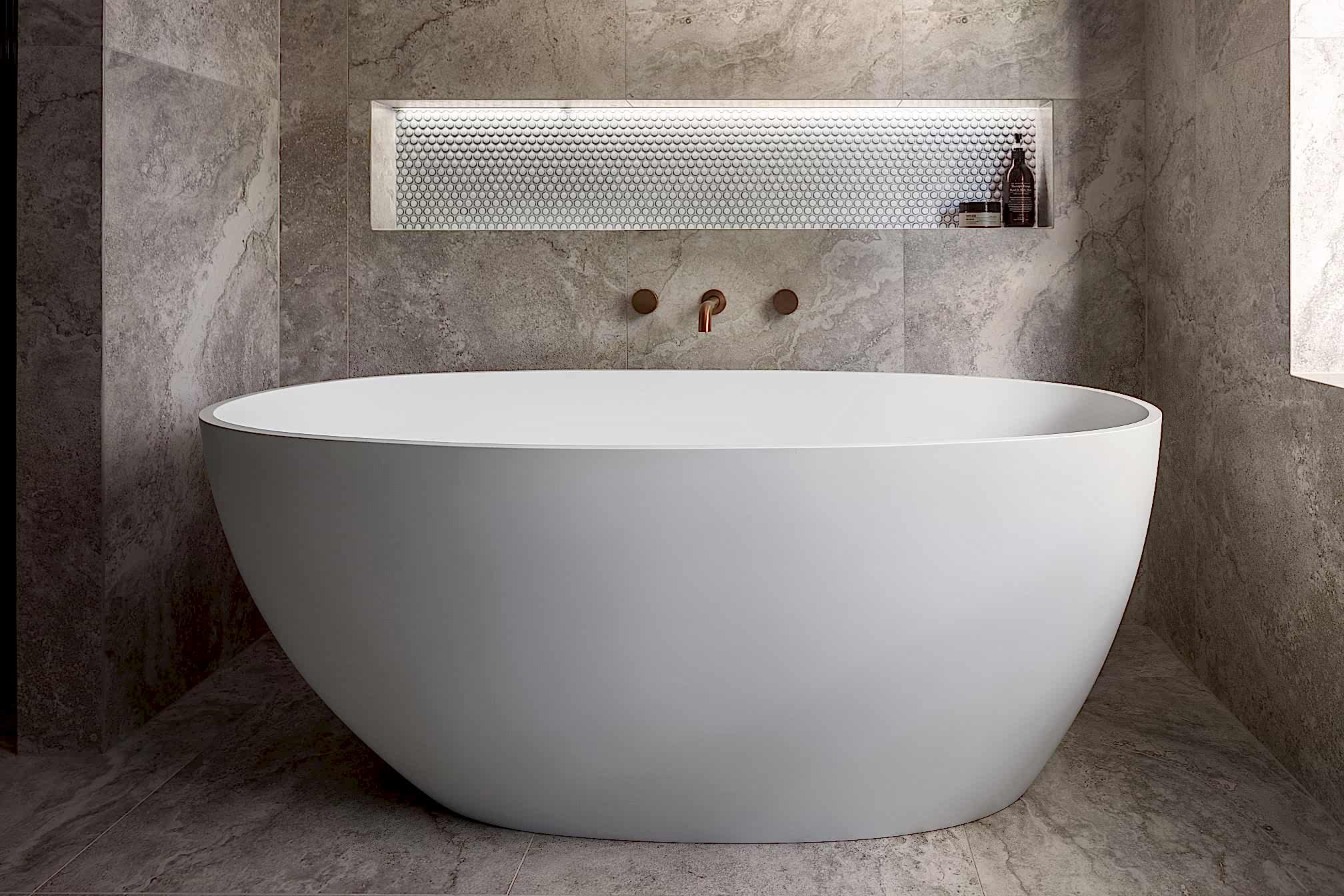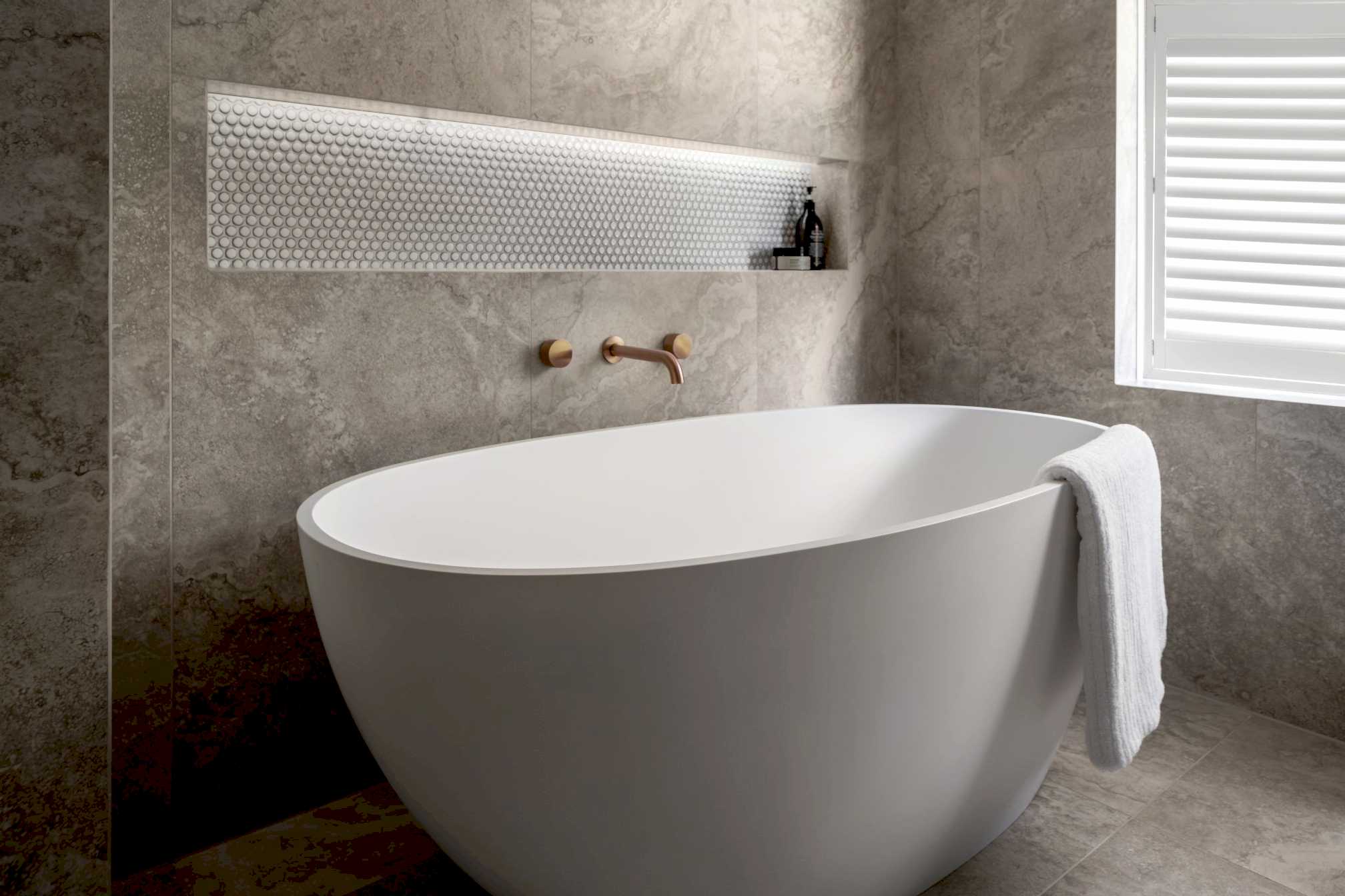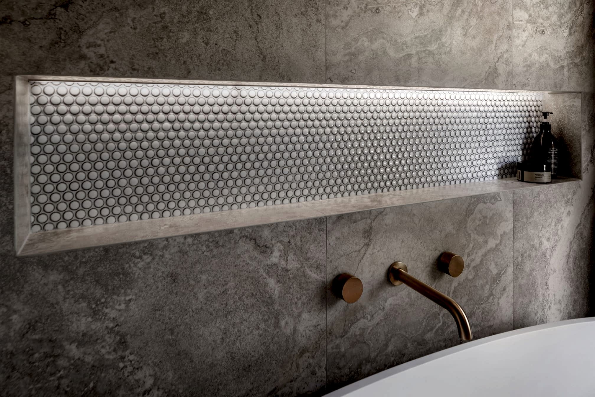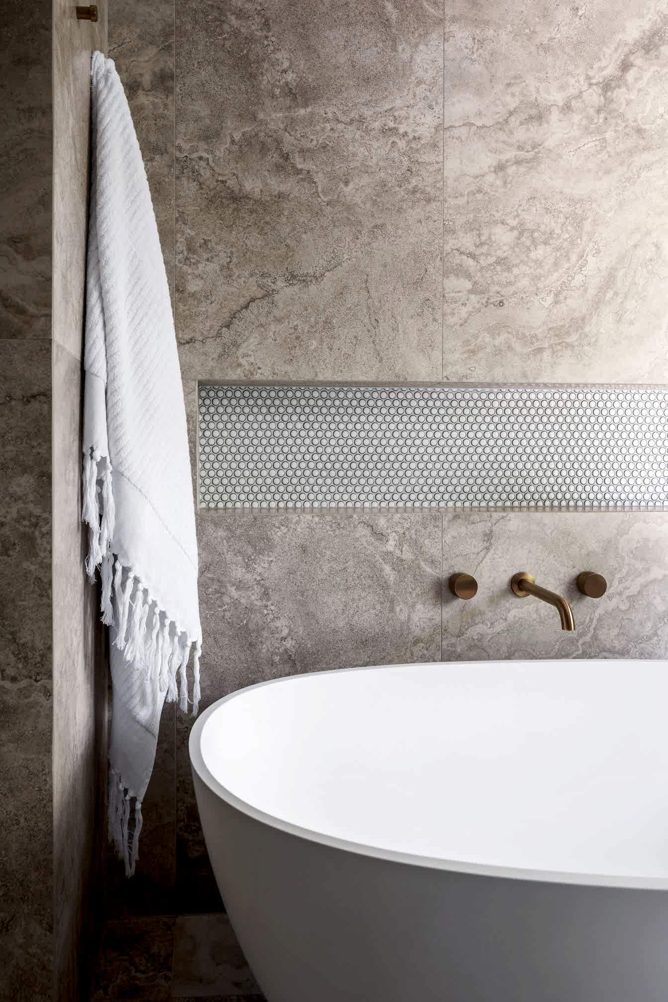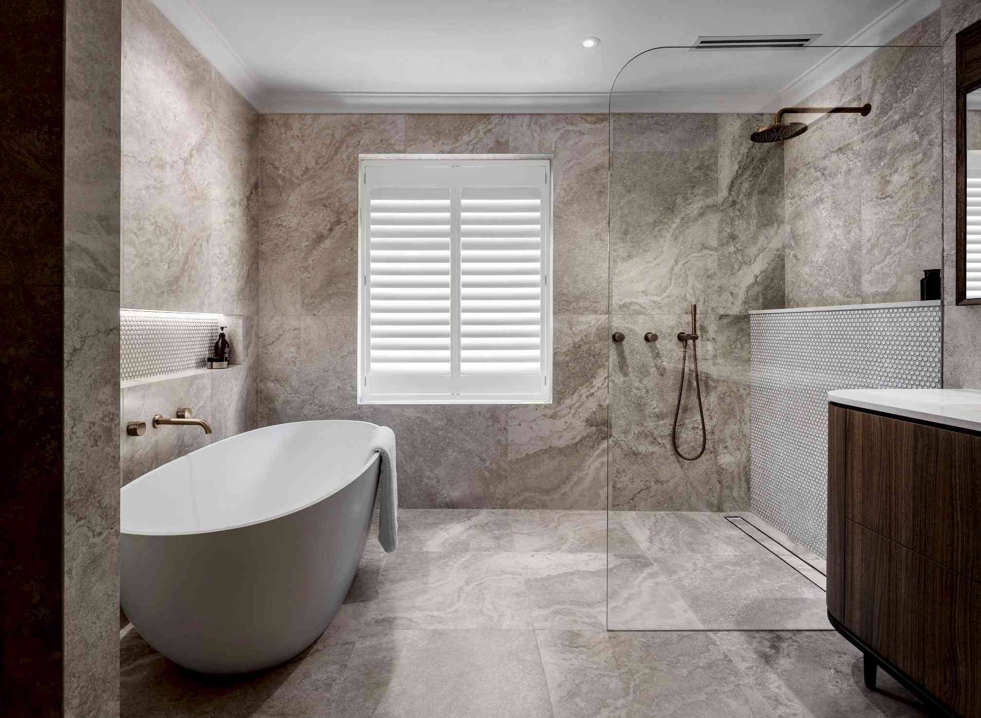 Our clients sought a stylish, user-friendly space with ample storage that aligns with both contemporary and mid-century modern design. Our interior design transformed the space into a seamless blend of contemporary minimalism and mid-century warmth. We removed the corner spa, expanding the shower and adding a separate toilet room. The ensuite now features warm neutral tones, custom walnut cabinetry with subtle curves, and bronze hardware that ties the design together. Stone-look porcelain tiles extend floor to ceiling, enhancing the room’s spaciousness. The centerpiece is a custom walnut vanity with curved edges, paired with an organic white Caesarstone benchtop and recessed mirrored cabinetry. A Mona brass feature light adds a luxurious touch.