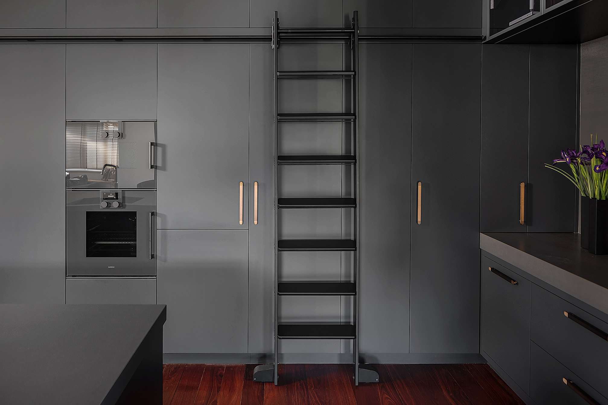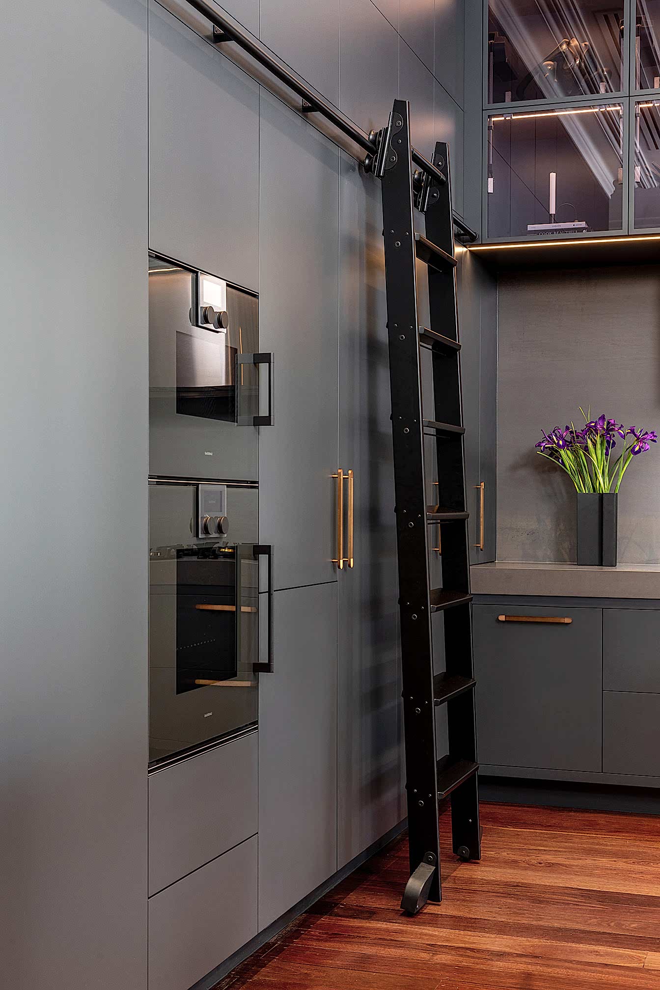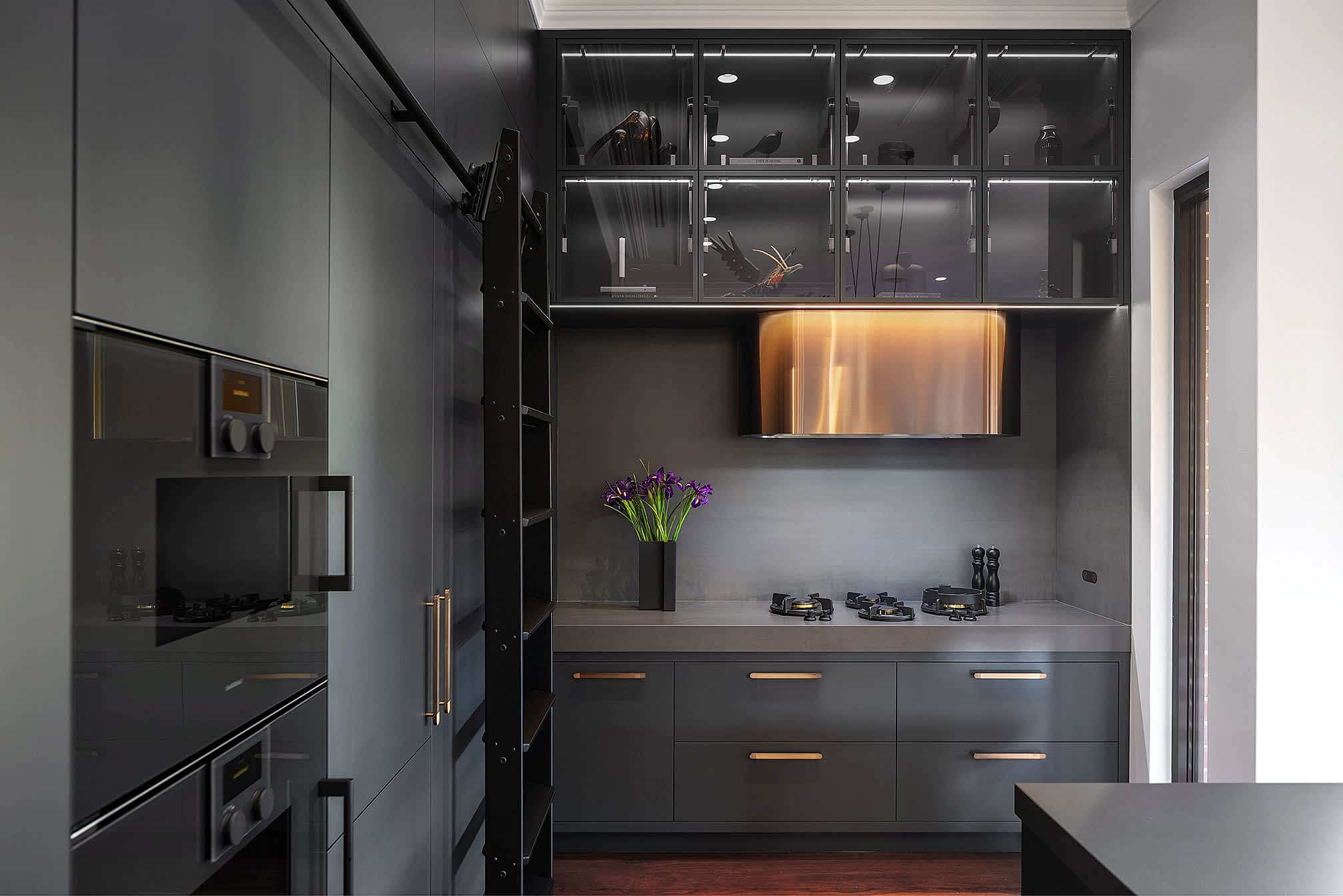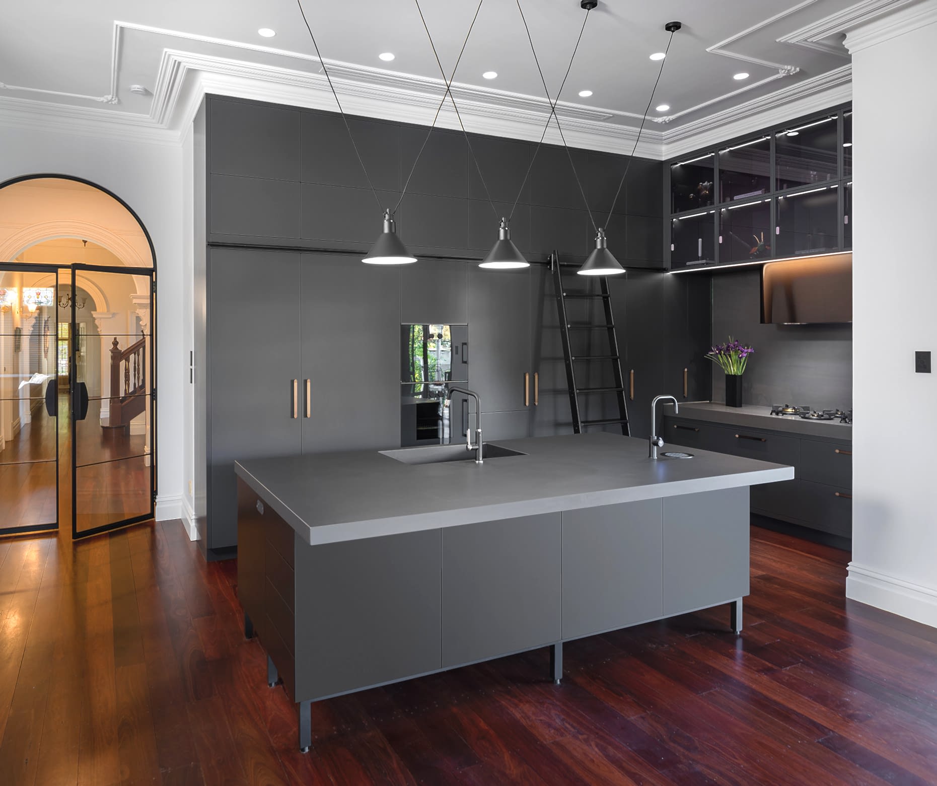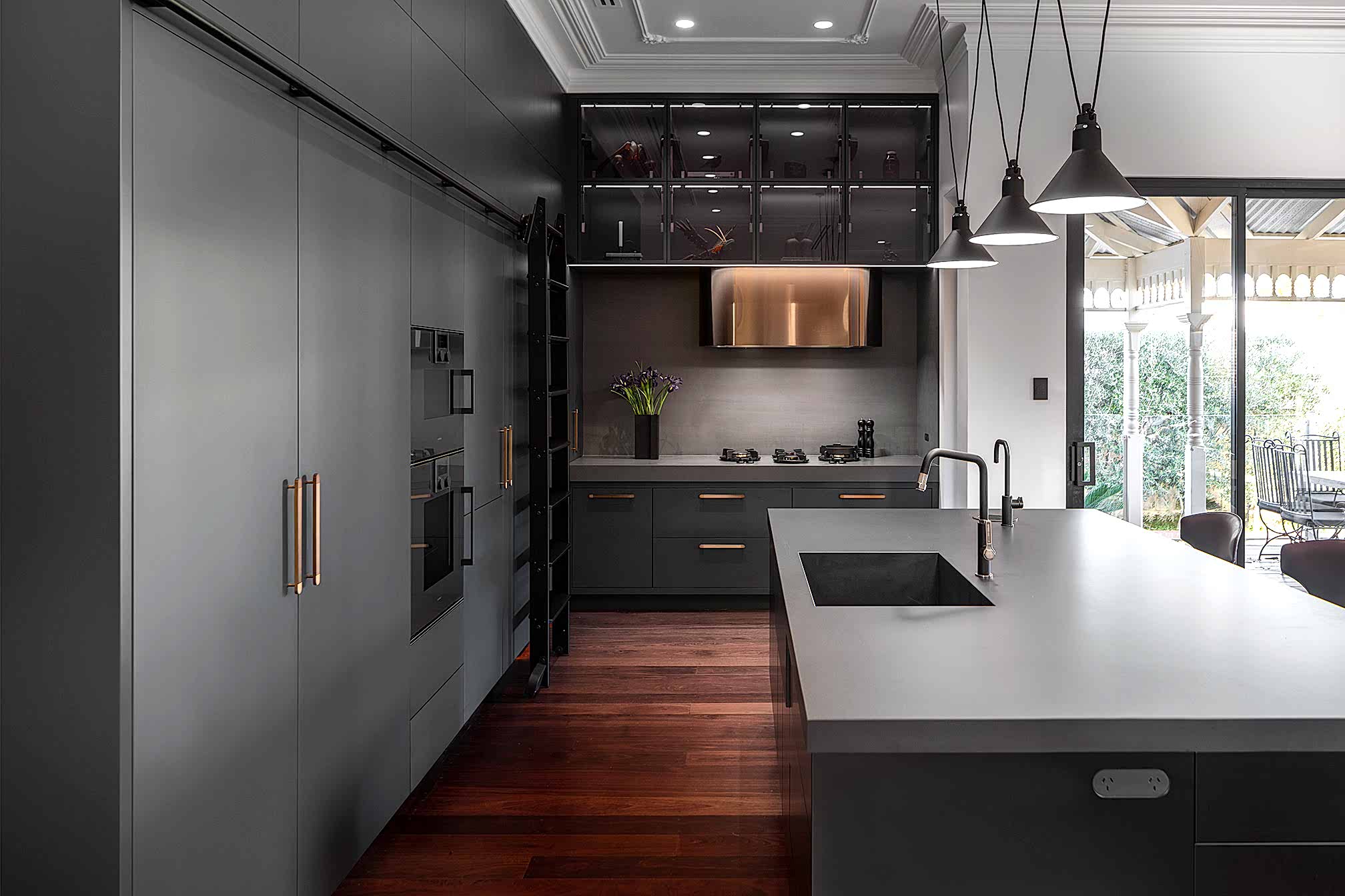 Our client sought an industrial-style kitchen renovation that complements their heritage home while enhancing functionality for entertaining. Previously a French Provincial kitchen, our interior design transformed the space by introducing a large island bench with ample prep space and seating, fostering a more open and engaging atmosphere. We used a dark colour palette with matte charcoal cabinetry, integrated black appliances, and a black butler’s sink, accented by bronze hardware and a custom bronze rangehood. Industrial elements are highlighted through charcoal framed glass cabinets and black aluminium windows, while the black rolling library ladder offers both function and style. The design also includes a mini butler’s pantry for additional storage and a bar nook, creating a sleek and cohesive space perfect for modern living and entertaining.