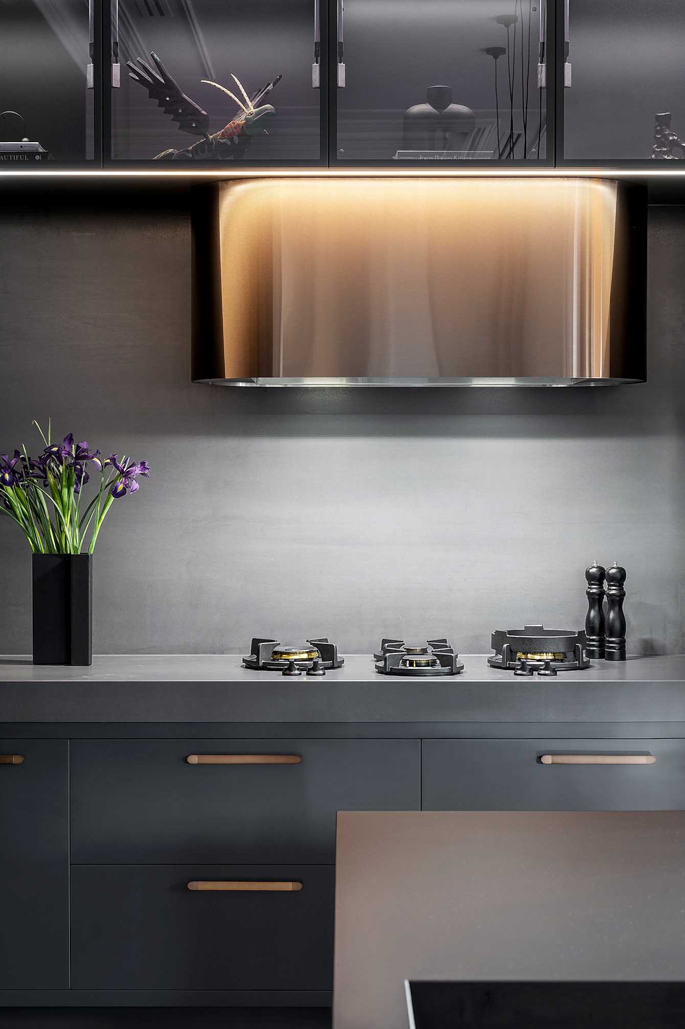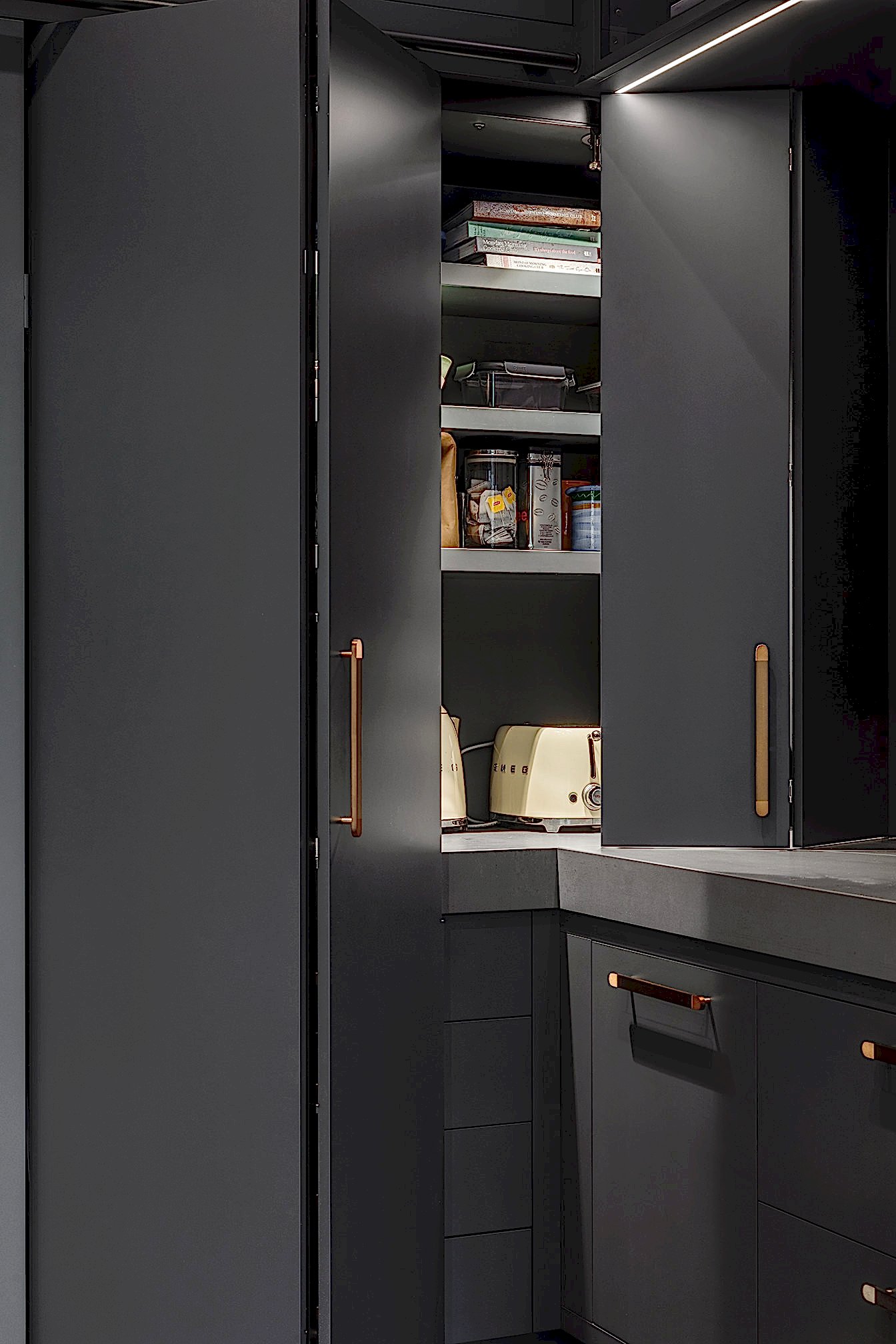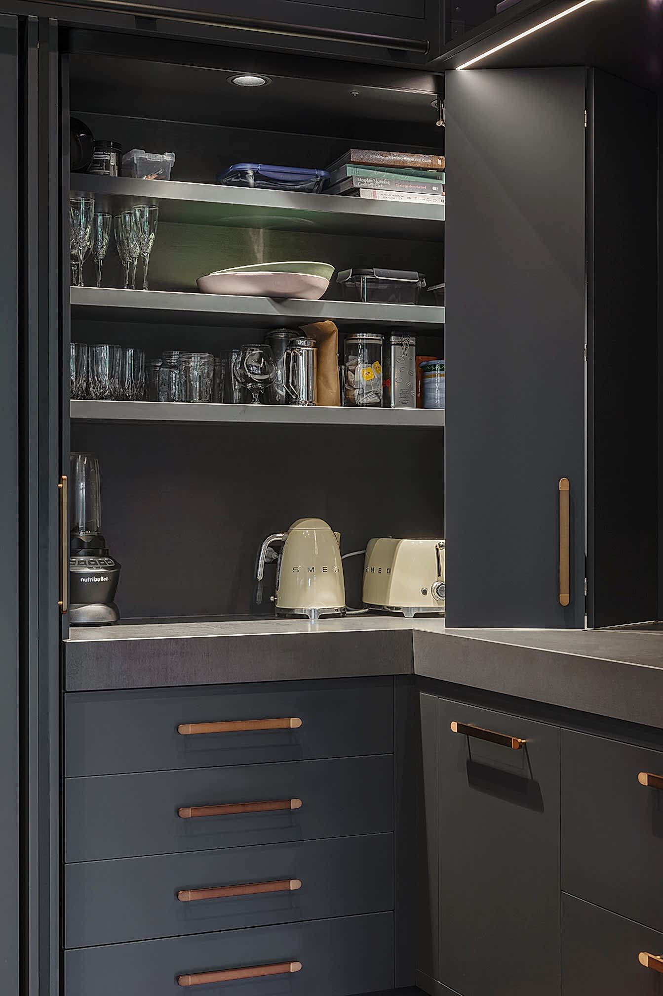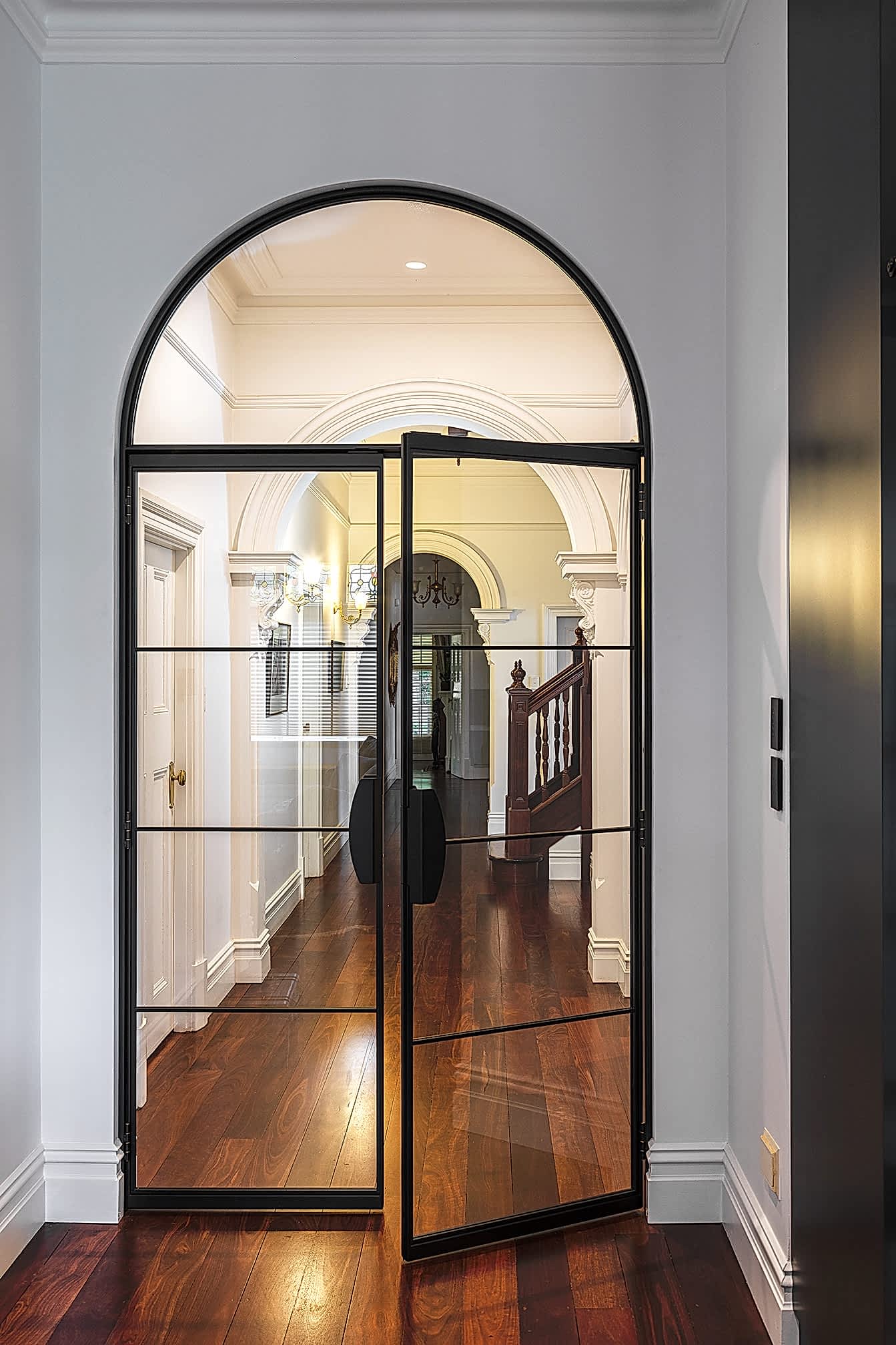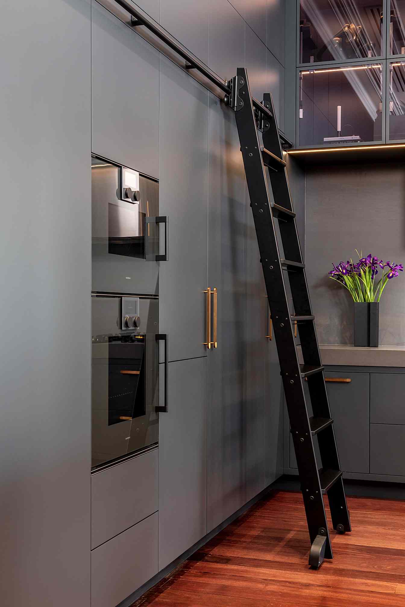 Our client sought an industrial-style kitchen renovation that complements their heritage home while enhancing functionality for entertaining. Previously a French Provincial kitchen, our interior design transformed the space by introducing a large island bench with ample prep space and seating, fostering a more open and engaging atmosphere. We used a dark colour palette with matte charcoal cabinetry, integrated black appliances, and a black butler’s sink, accented by bronze hardware and a custom bronze rangehood. Industrial elements are highlighted through charcoal framed glass cabinets and black aluminium windows, while the black rolling library ladder offers both function and style. The design also includes a mini butler’s pantry for additional storage and a bar nook, creating a sleek and cohesive space perfect for modern living and entertaining.