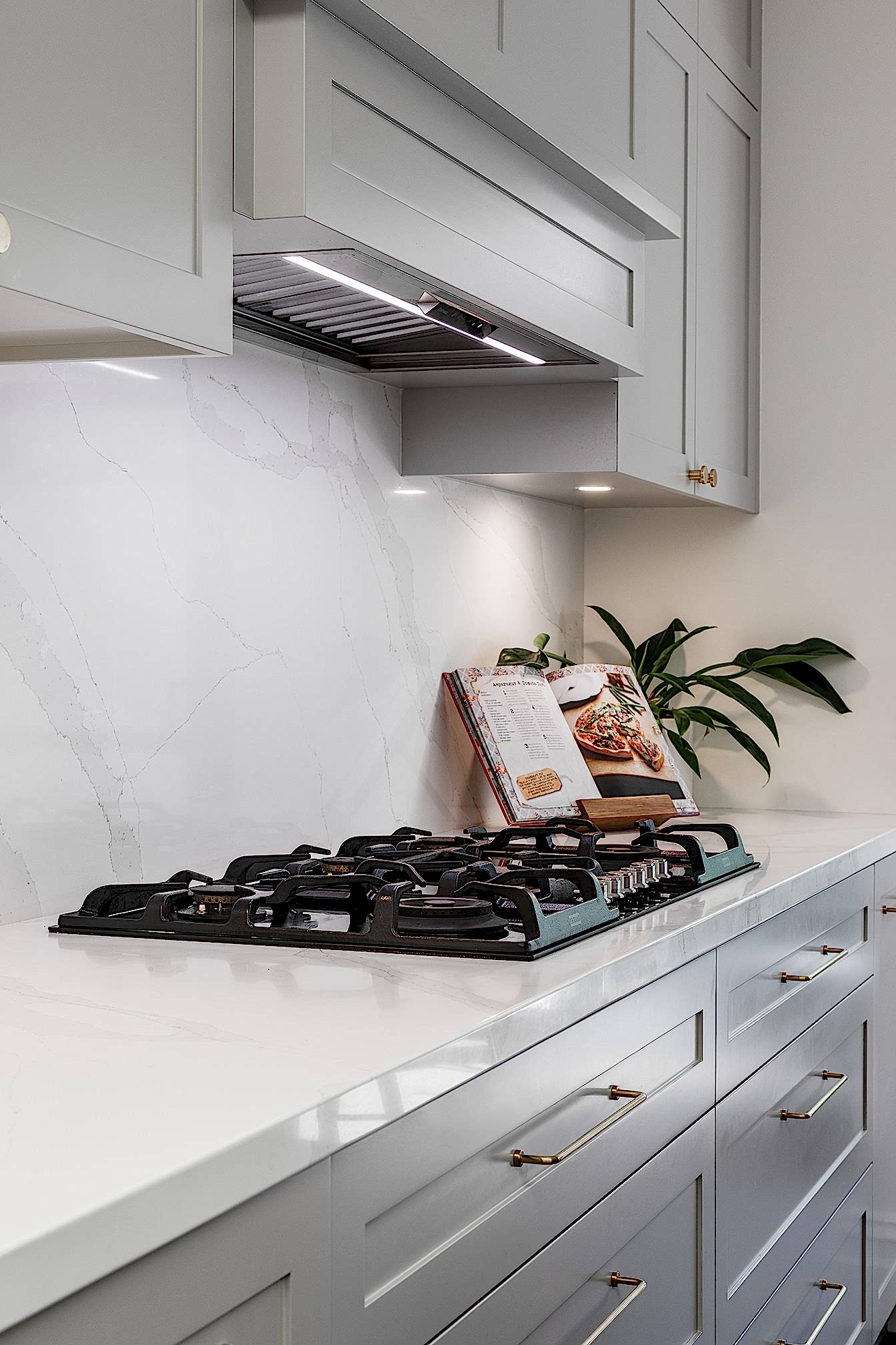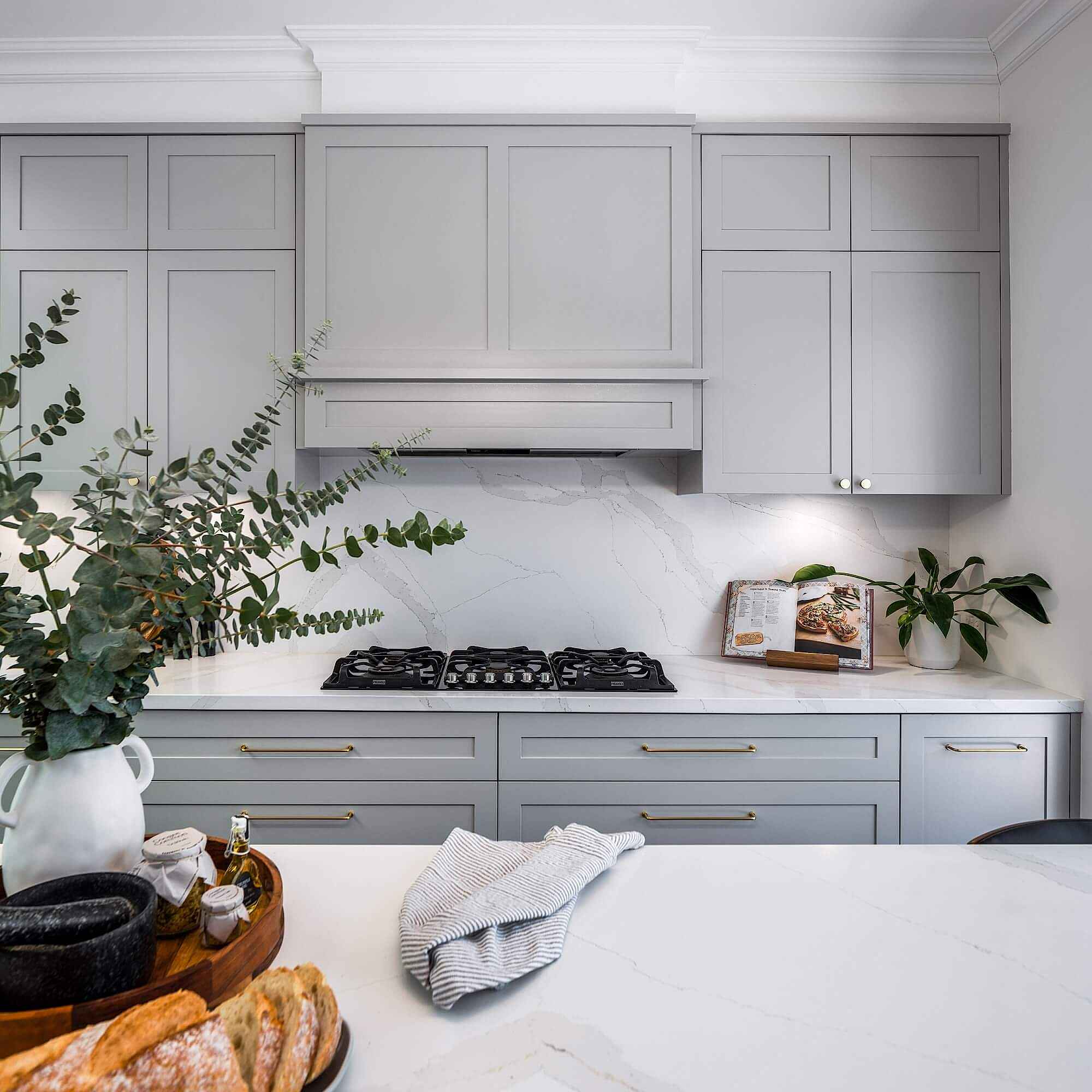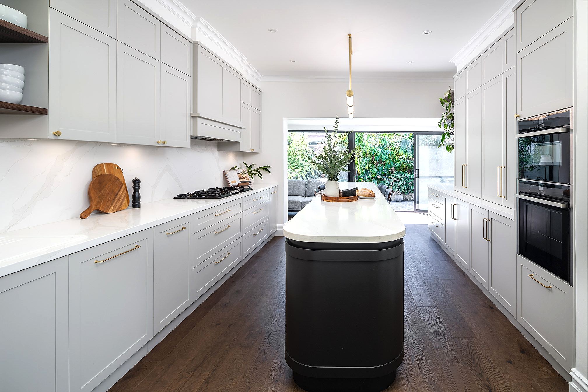 By removing the built-in corner pantry, a custom island bench now leads the room, seamlessly connecting to the alfresco dining area. The island features a Caesarstone benchtop, bold cabinetry throughout the room, and casual seating for four, enhancing both style and practicality. To allow optimal natural light to flow through the kitchen and surrounding rooms, we changed over the two interior doors to glass pane doors and removed the old blinds in the existing skylights. In addition, we replaced the sliding doors that opened out to the alfresco, to new larger glass doors that consequently brought in more daylight.